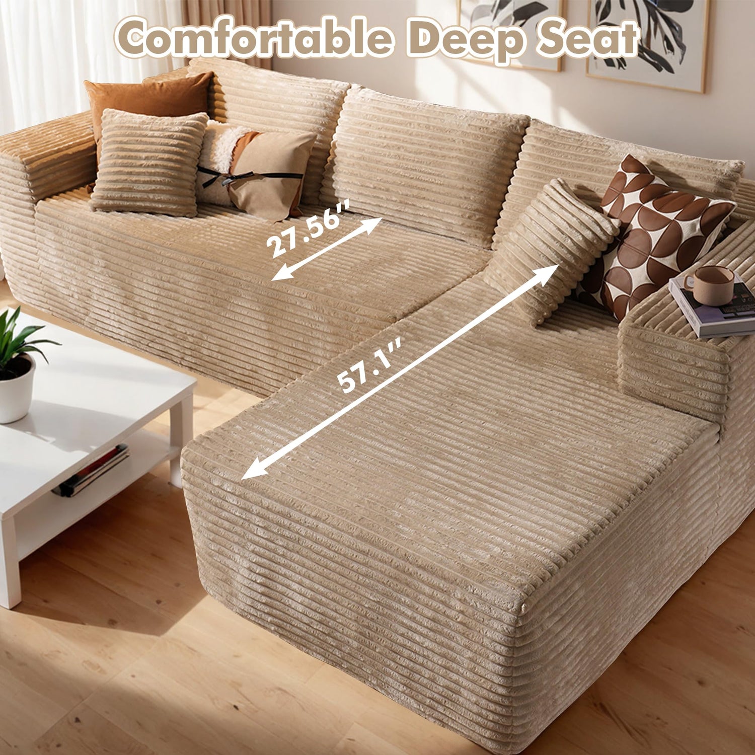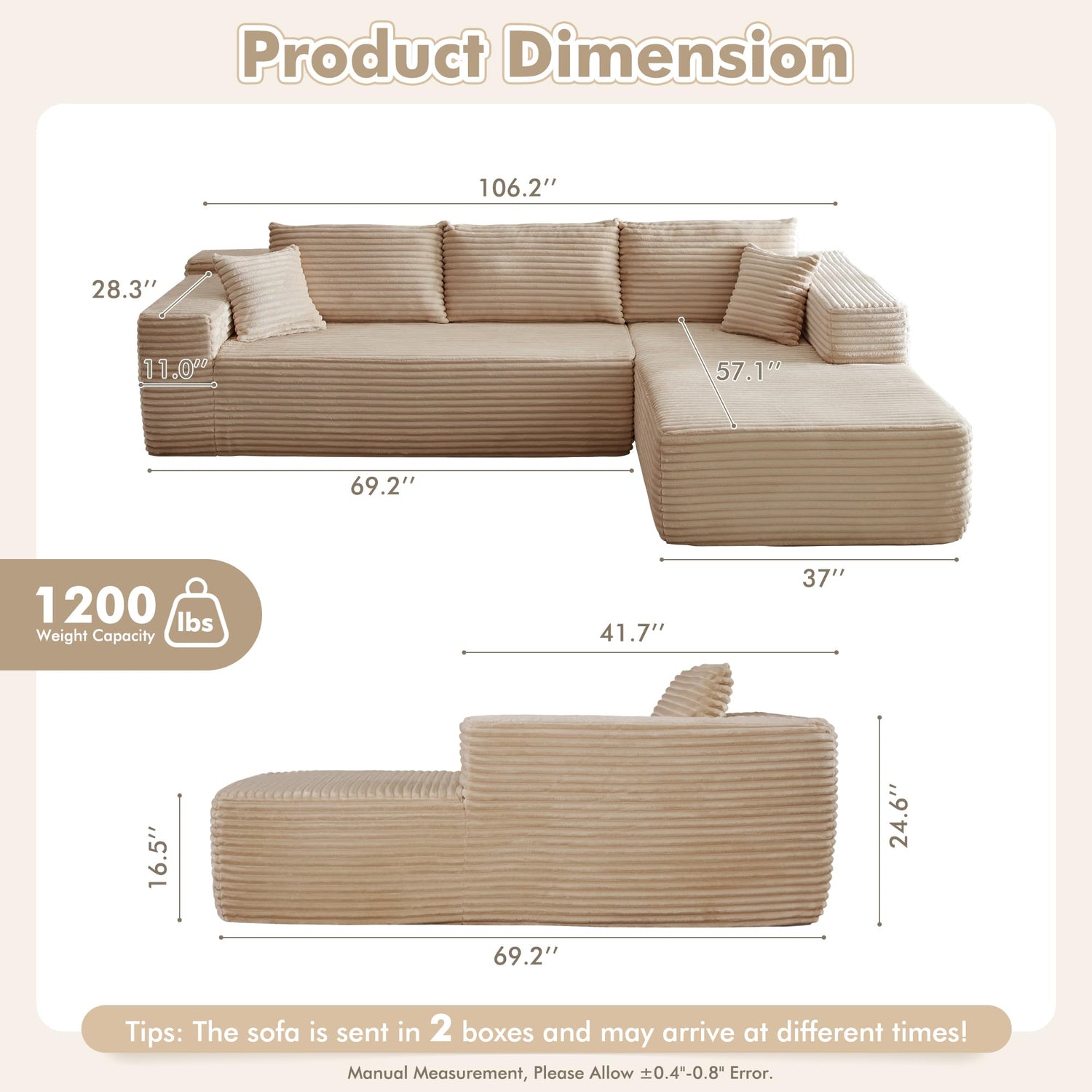 106" Cloud Sectional Couch with Chaise Longue,L Shaped Modular Modern Sofa,Comfy Corduroy Fluffy Couch with Deep Seat,No Assembly Required Couch for Living Room(Right,Plush Corduroy,Beige)