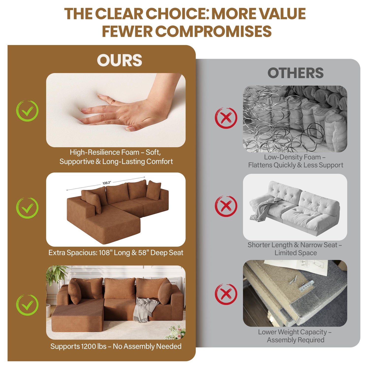 108" Modular Sectional Sofa with Oversized Chaise & Deep Seat, Comfortable High-Density Memory Foam Boneless Cloud Couch, No Assembly Required Sectional Couches for Living Room, Bedroom (Brown)