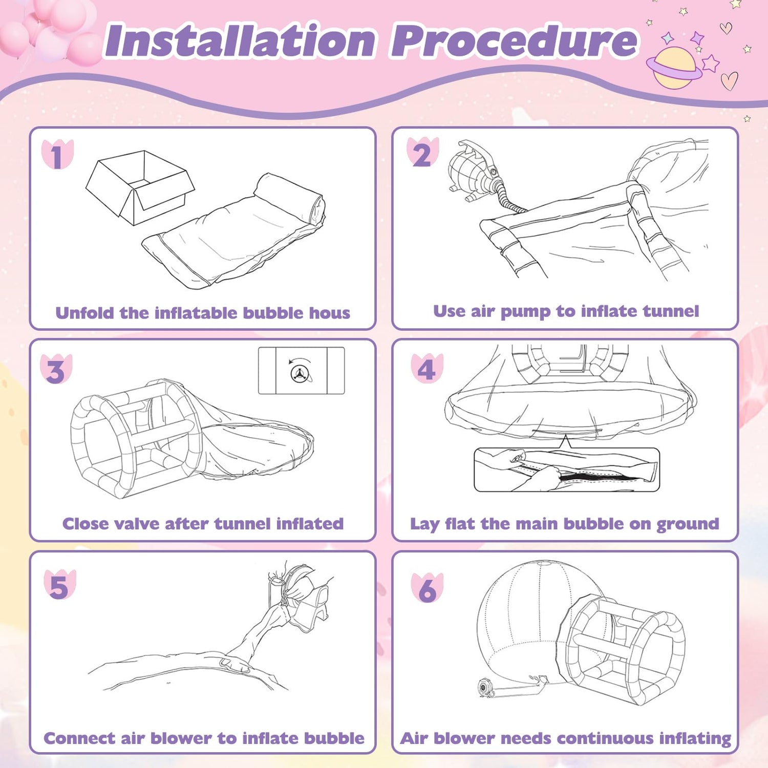 - Easy to Assemble: Installation inflatable bubble is very easy, just take out the bubble tent, connect the hair dryer, click to inflate, pull on the vent, and then fix it on the position you want to complete the installation. It only takes 5 minute to blow up game and keeps it inflated throughout the show when plugged in.