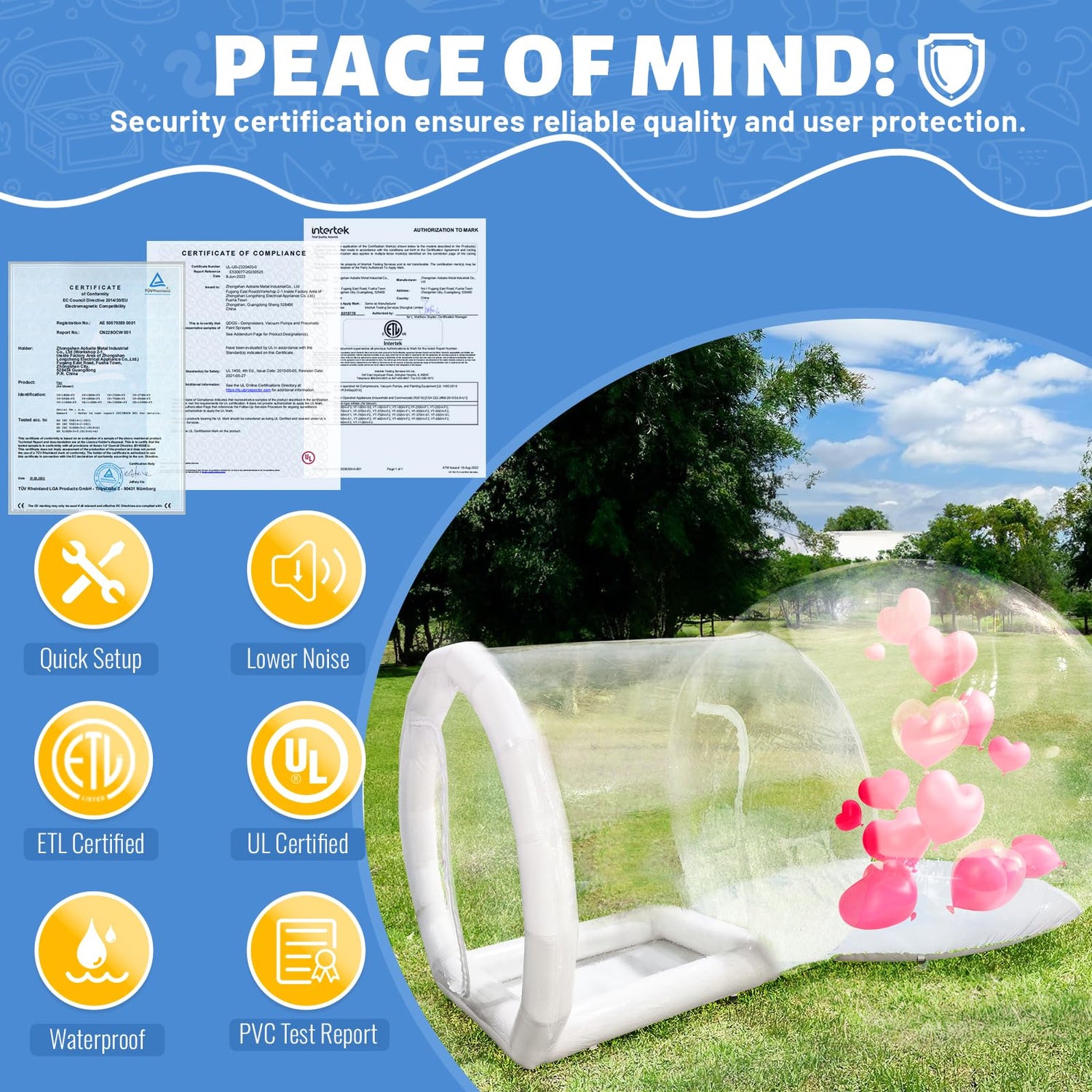 • Unique Design : The details of our inflatable bubble house design are different from others, which is why our product requires only one 550-watt blower to make the balloon spin easily and quickly inflate the clear bubble house. Other products require more power, or even two fans to achieve the same effect. When you're on the go, our Bubble House makes it lighter to carry and quicker to set up