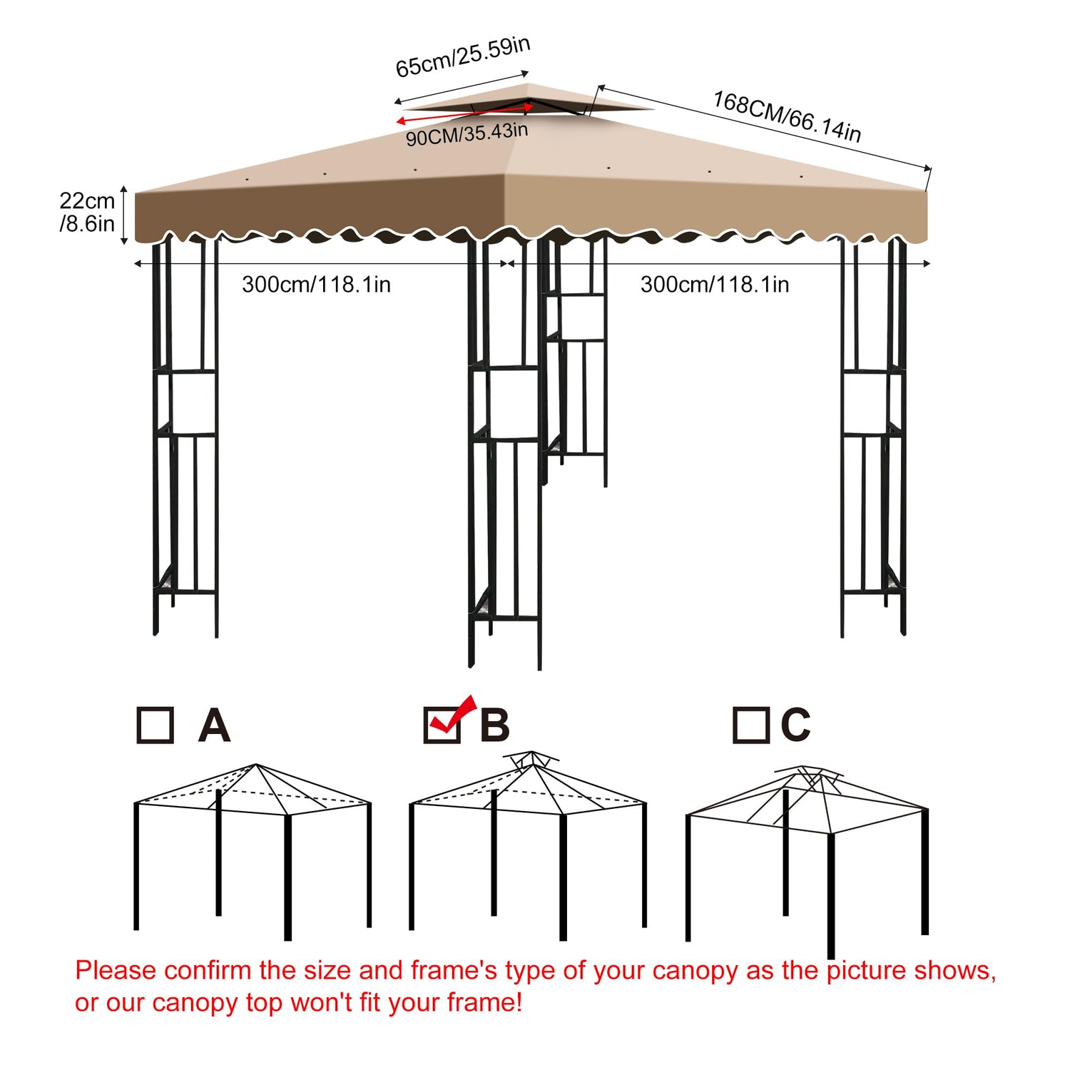 - 【Gazebo Canopy Specification】The top tier is 35.4inch in length & width, and the bottom tier of this gazebo roof is 118.1inch x118.1inch, fit for 10'X10' gazebo; it can provide shade for several people at once. Perfect for family gatherings, friends birthday parties, holiday festivals. ***Please check carefully if it can fit your gazebo frame before placing an order.