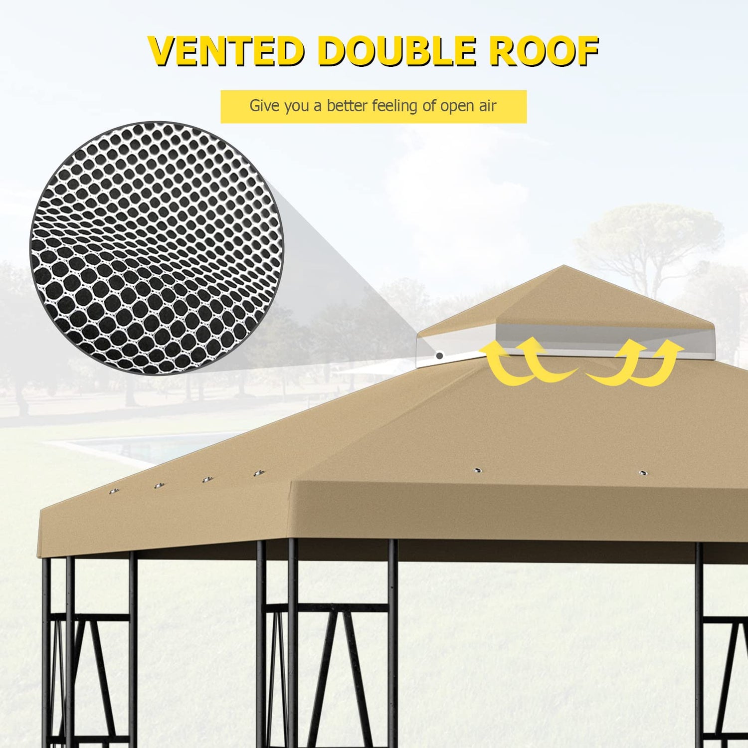 - The canopy cover adopts a double-layer roof design. The unique design allows wind and barbecue smoke to pass through quickly. Mosquito gauze net in the middle of the double top cover.