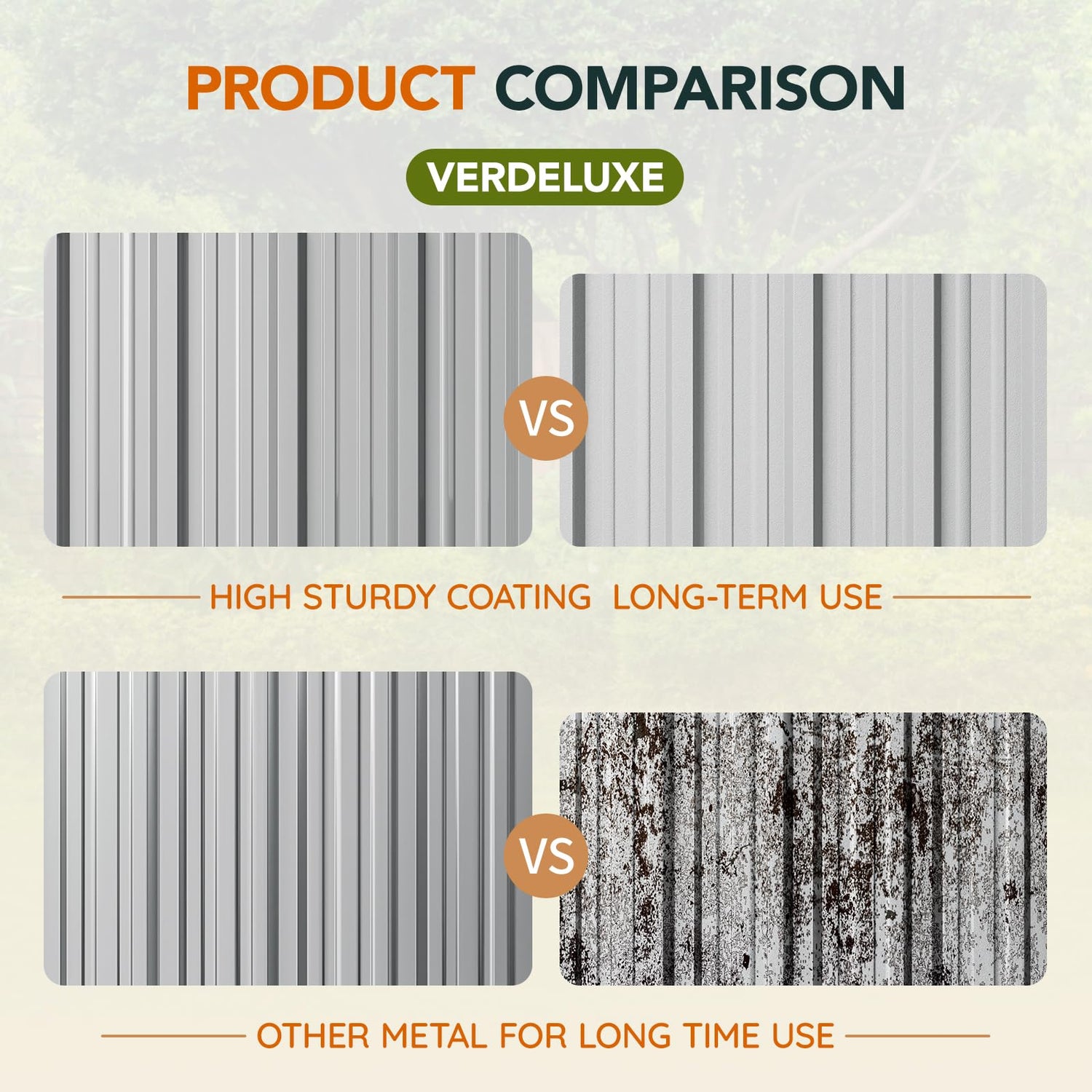 - 【Heavy-Duty Galvanized Steel Construction】Verdeluxe 10*12FT outdoor storage shed measures 115"L×140"W×88.6"H (roof dimensions: 115"L×145.2"W).Crafted from galvanized steel,the shed laughs off blistering sun,brushes off heavy rain, and stays strong through every season.Blending industrial sturdiness with modern aesthetics, the shed features clean lines, a subtle galvanized texture, and colour Matte Gray finish,easily complementing any outdoor decor style.