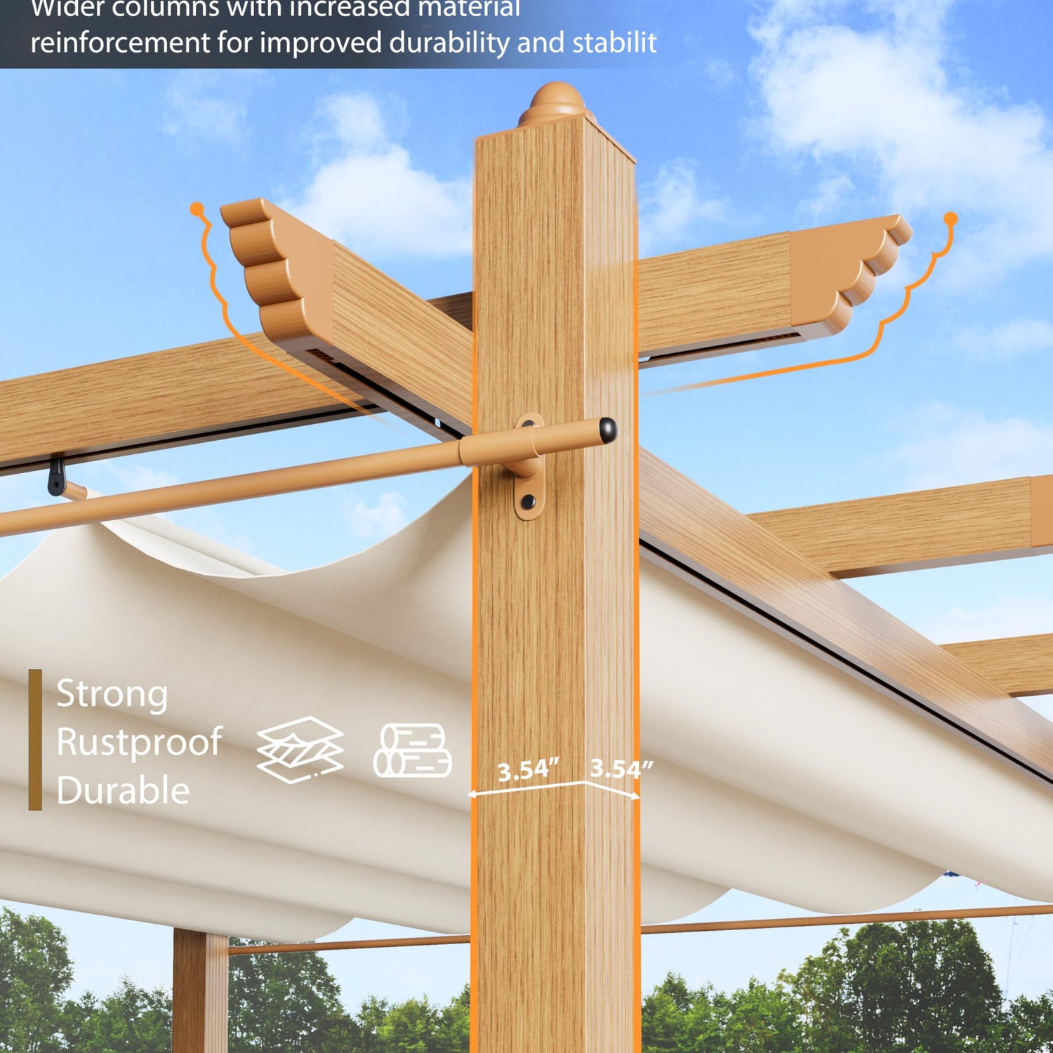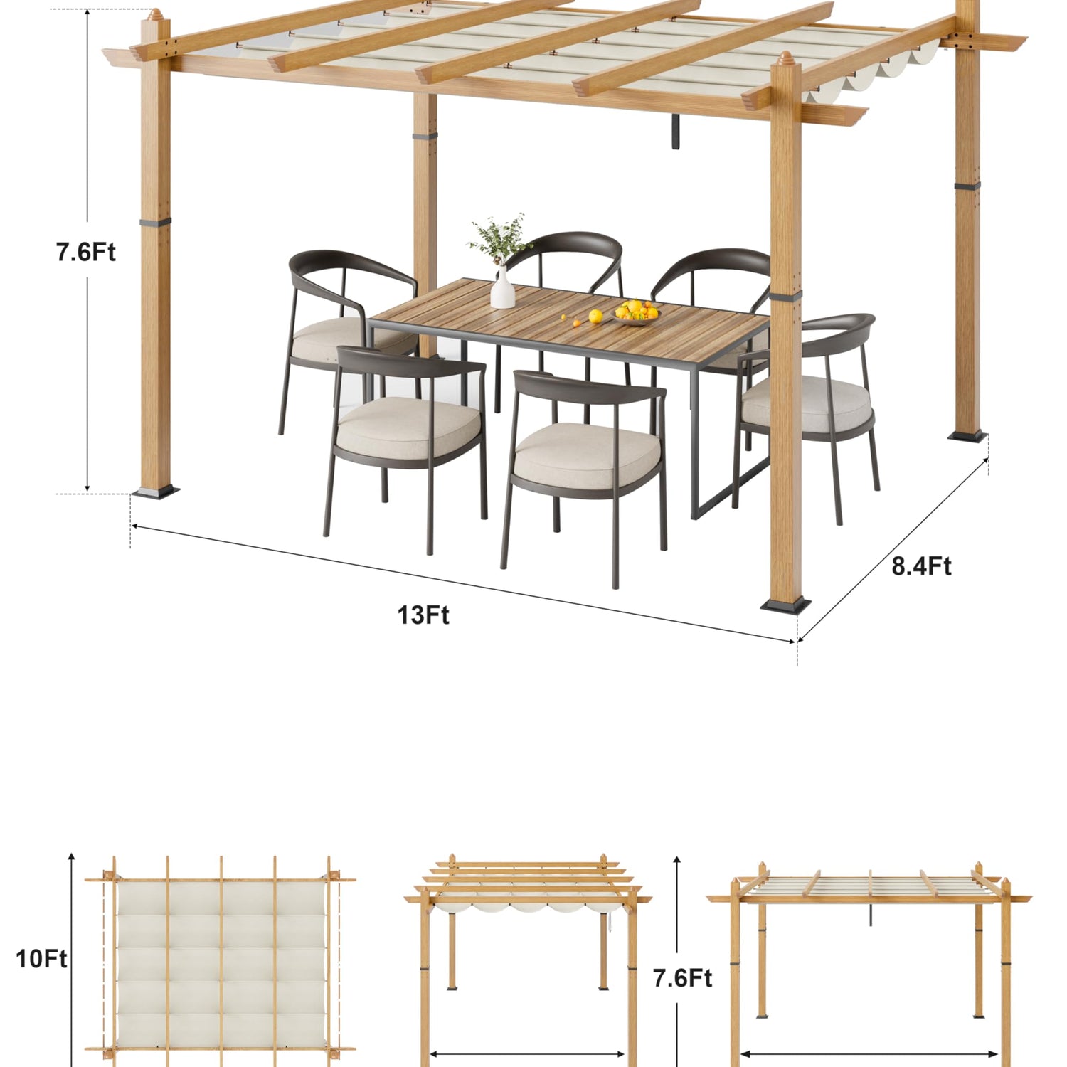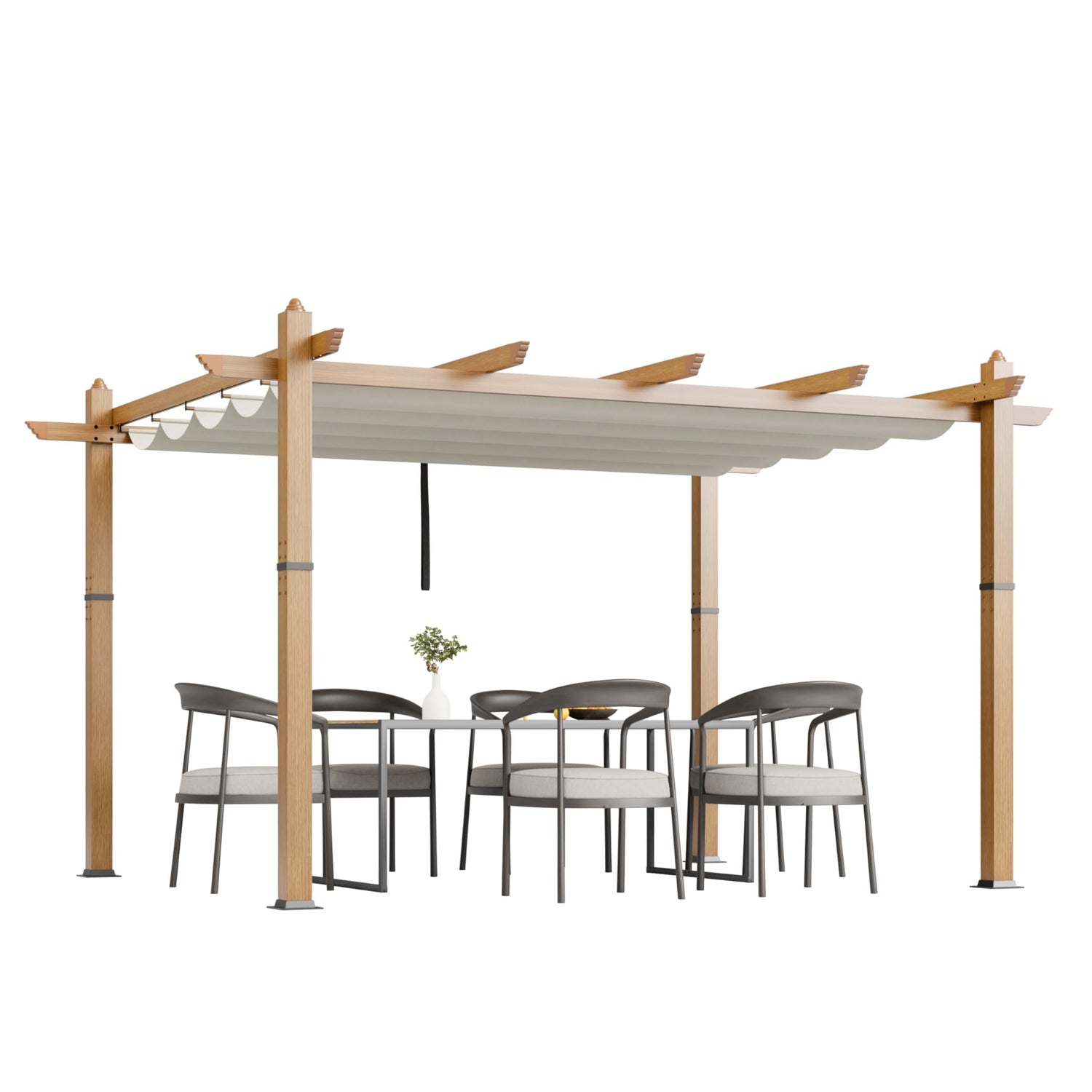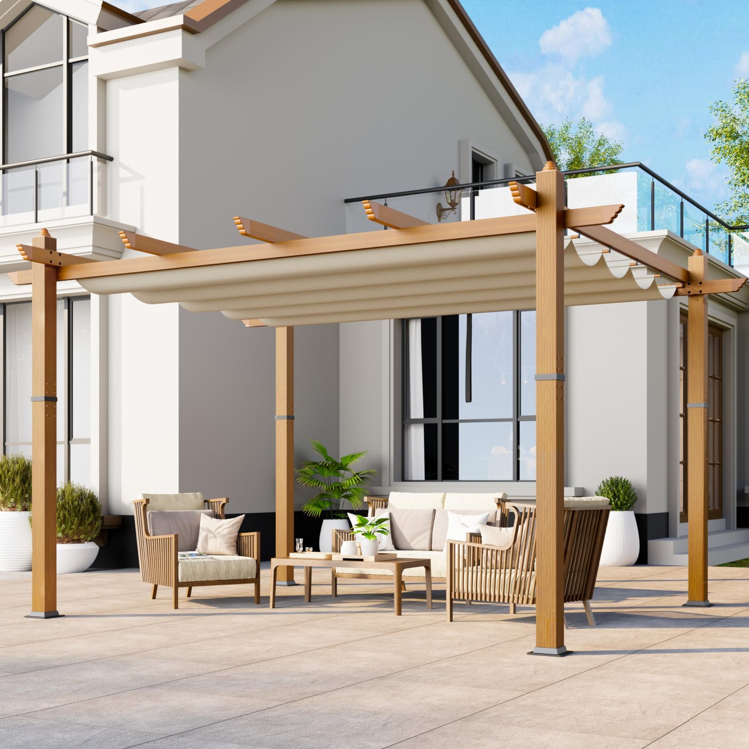 10x13 Ft Outdoor Retractable Pergola Aluminium Pergola Canopy with Adjustable Roof, Upgraded Faux Wood Grain Modern Metal Patio Gazebo for Deck, Backyard Garden, Porch, Grape Trellis, Beige