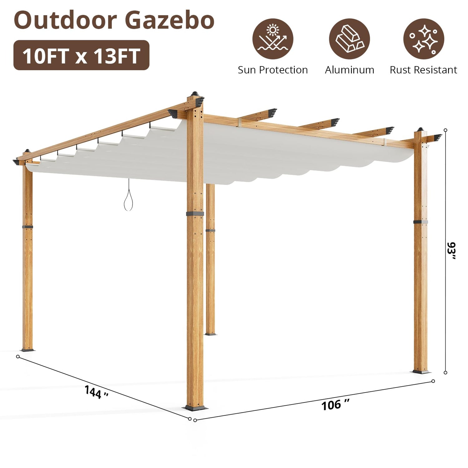 10x13 Ft Outdoor Retractable Pergola with Sun Shade Canopy, Heavy-Duty Aluminum Canopy Pergola Kits for Backyard, Faux Wood Grain Metal Patio Gazebo for Garden, Porch Beach, Grape Trellis - Beige