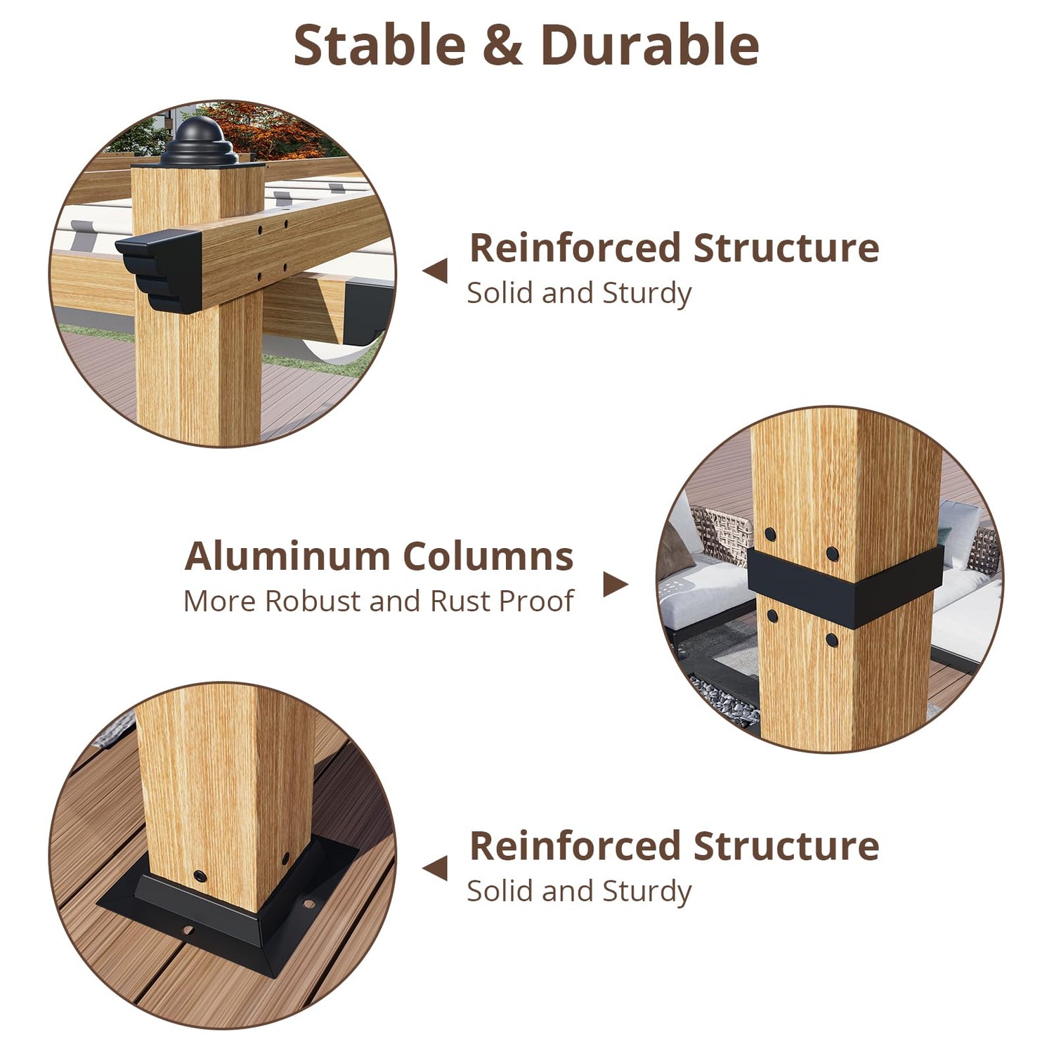 - 【 Upgraded Aluminum Metal Frame 】The retractable canopy pergola for patio is made of aluminum frame with a powder-coated finish, providing rust and corrosion resistance. Four wide metal feet with pre-drilled holes ensure the patio pergola stands more stable on different ground surfaces. The sturdy frame greatly improves the stability and ensures its long-term use
