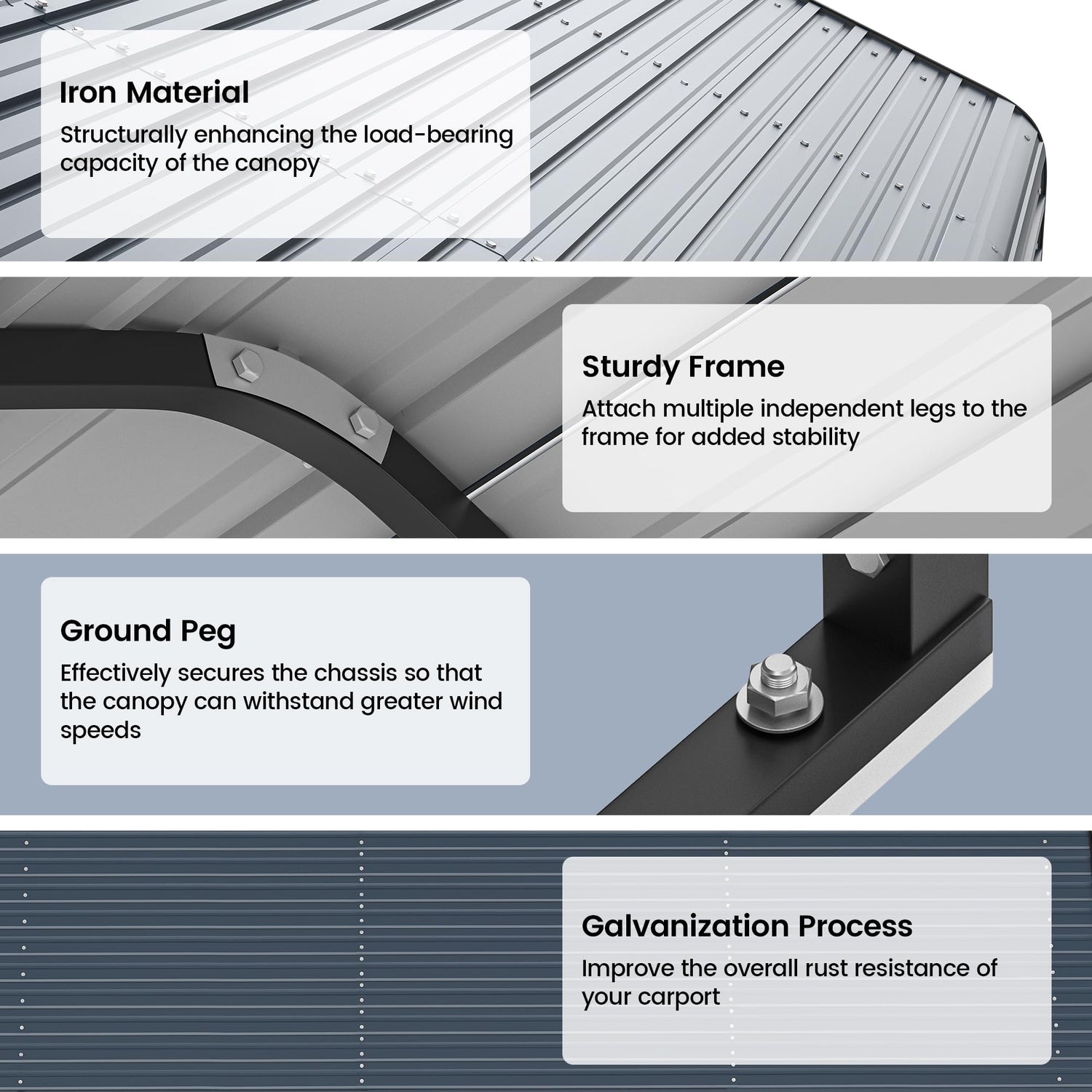 - Reinforced Base: The base has been carefully designed to add extra pegs, which can enhance the overall stability and improves the service life of the carport without affecting the aesthetics.