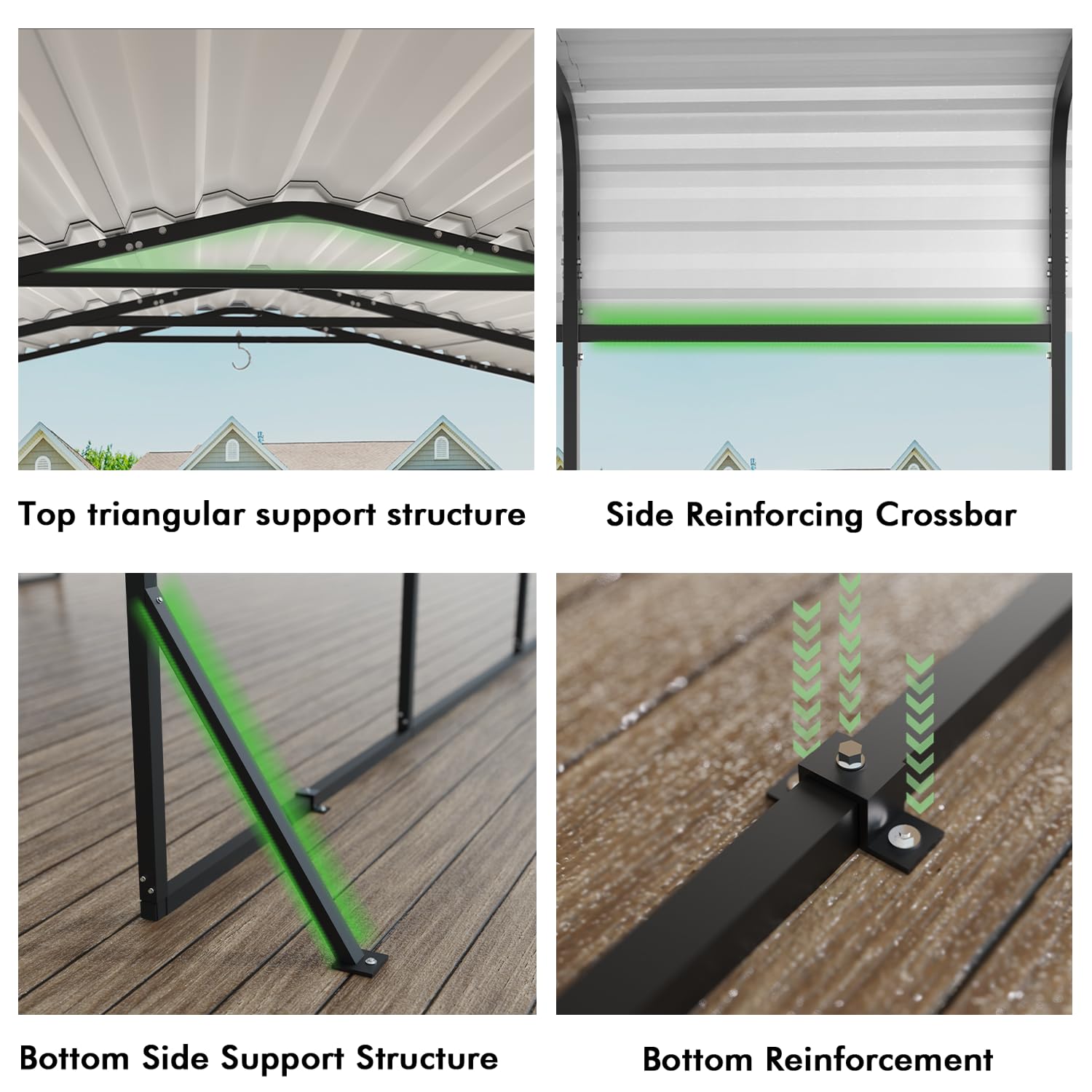- Reinforced Structural Support - This Metal Carport features a reinforced triangular design on the top that greatly enhances load-bearing capacity. The extended edges of the Carport improve rainproof performance, while four side rods and ground reinforcements add stability. As a Heavy Duty Carport Canopy, it protects vehicles, boats, and equipment with durability and strength