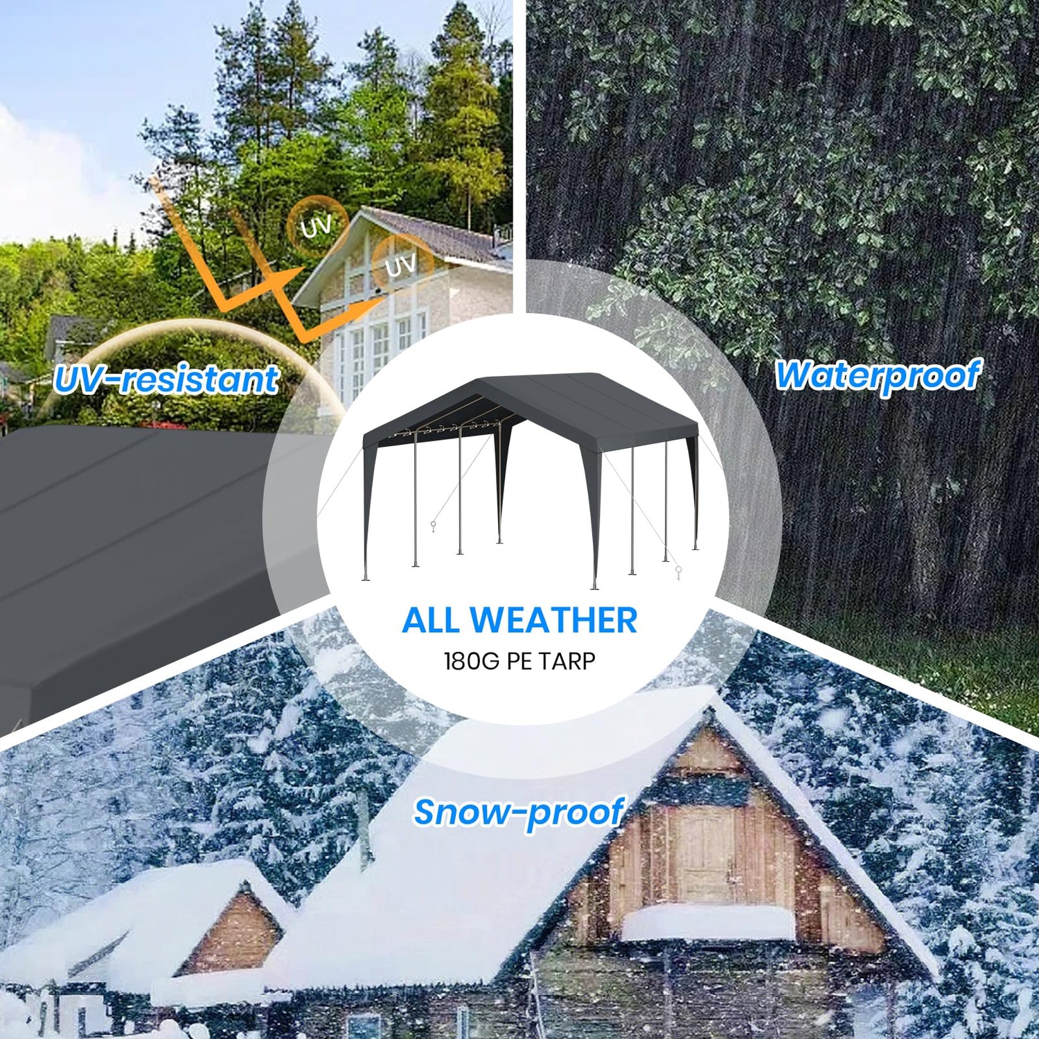- UV-Resistant & Waterproof Tarp:The carport features a durable UV-resistant, waterproof PE tarp that protects your belongings from harmful UV rays, rain, and snow. This all-weather canopy ensures long-lasting performance and reliable protection year-round.