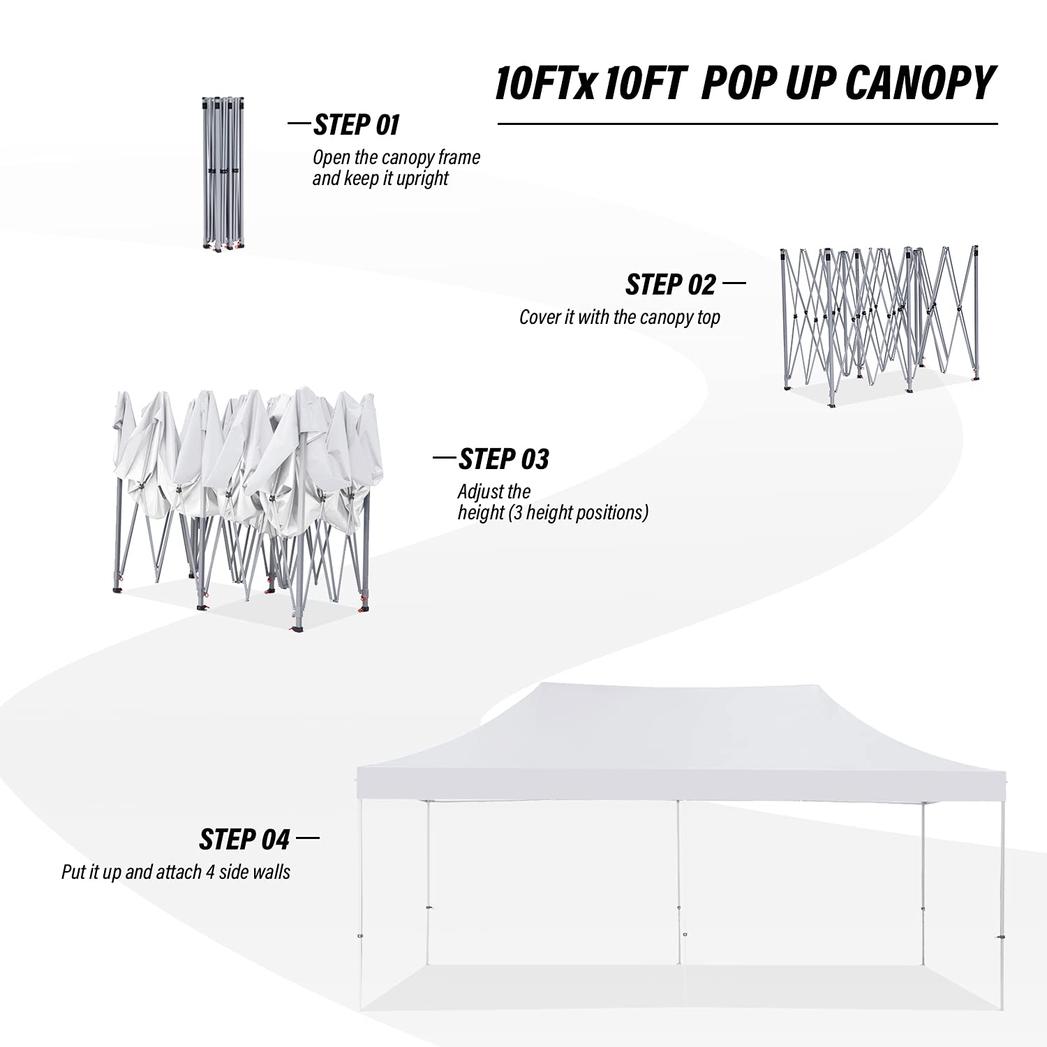 - ✅【Upgraded Sturdy Folding Frame】Sturdy and durable with upgraded steel frame construction, reinforced stress points where the peaked poles meet, and plastic components. Our steel frame is also detachable, which is very convenient for replacement. ☀ The frame comes fully assembled, everything is included and ready to start using your canopy tent right away!