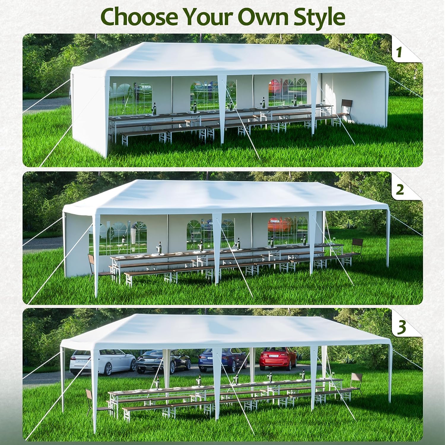 - Large Inner Space: The 10' x 30'outdoor tent has spacious inner space for you and your friends to have activities. It can hold many people for dining, party or wedding together. Regardless of rain or sunshine, it will probably not affect outdoor activities if you have such a canopy. What's more, the canopy can also be a temporary garage for your car, tools, patio furniture.