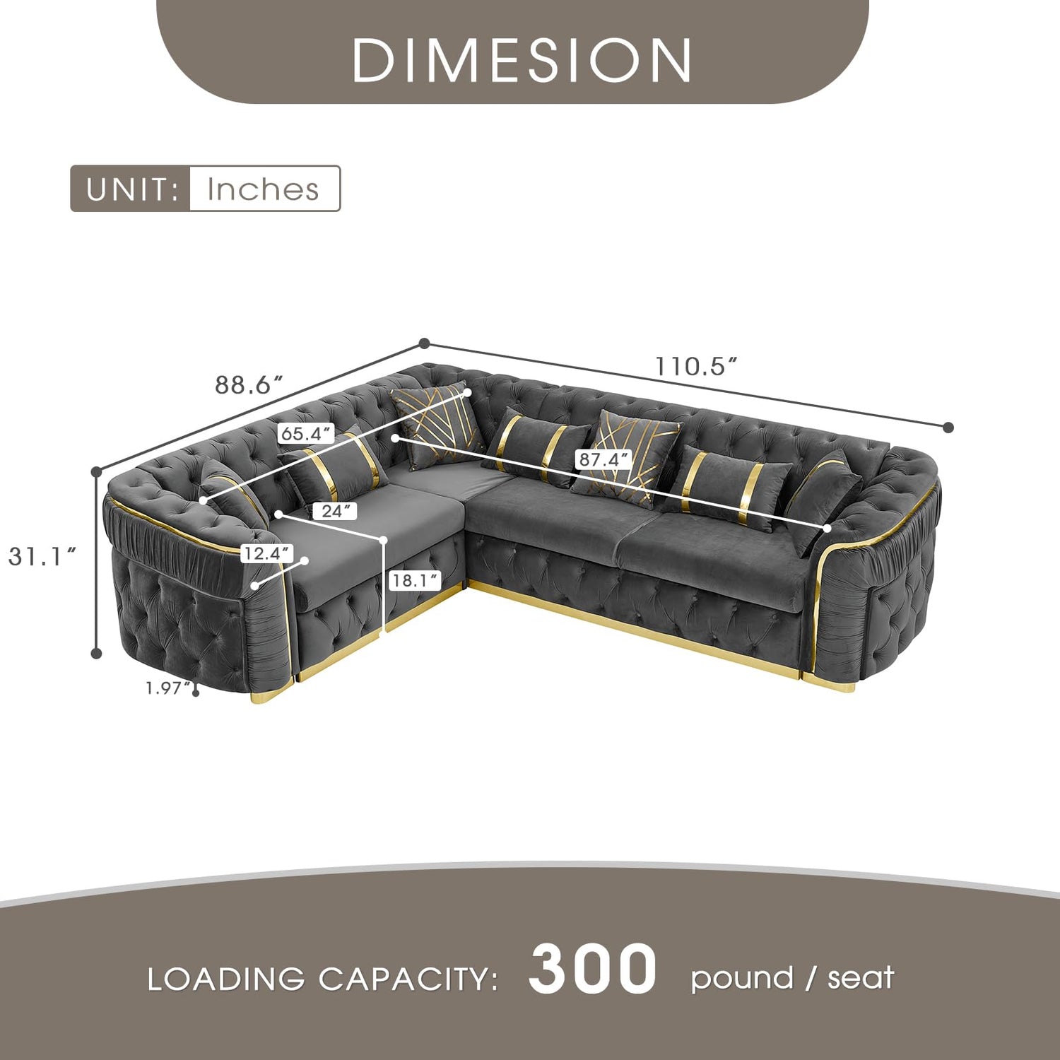 110.5" Luxury Velvet L Shape Chesterfield Sofa Set with Glod Metal Accents, Oversize Victorian Curved Arm Sofa Sectional Couches for Living Room with 7 Pillows, Left Chaise, Gray