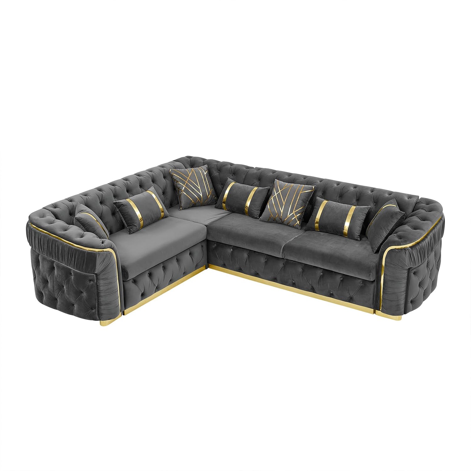 - [Luxury Chesterfield with Gold Decoration]: A seamless blend of opulent gold-plated 304 stainless steel detailing and classic tufted styling, contemporary with timeless elegance. A signature luxury sectional couch, setting the new tone for living room style.
