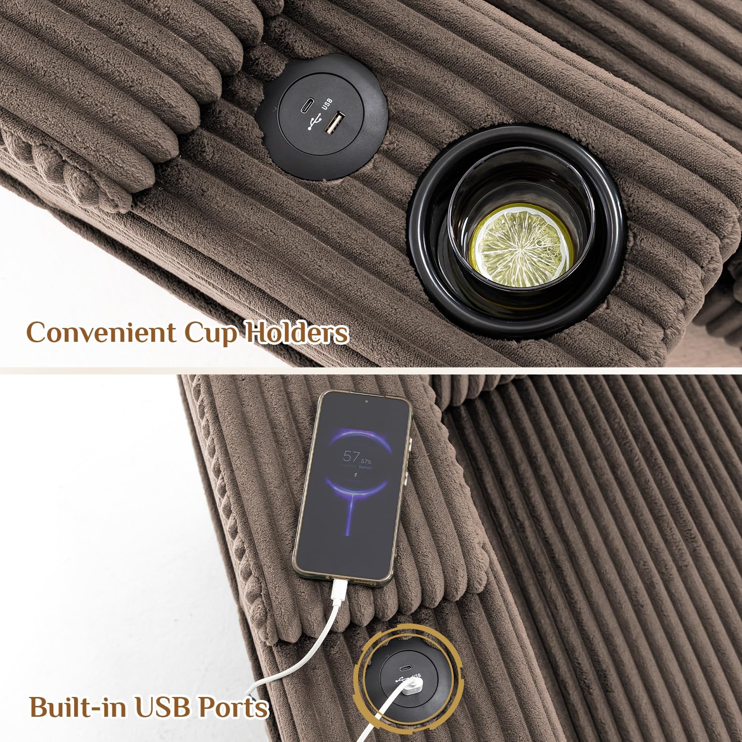 - Versatile Armrest: This cloud couch sectional comes with multi-functional armrests that enhance your comfort and organization. It includes hidden storage to keep items neatly stowed and out of sight, helping maintain a clutter-free space. There are also convenient side pockets to keep reading materials within easy reach. A built-in cup holder securely holds your drinks to prevent spills, while integrated USB ports allow easy charging so you can stay connected without leaving the couch.