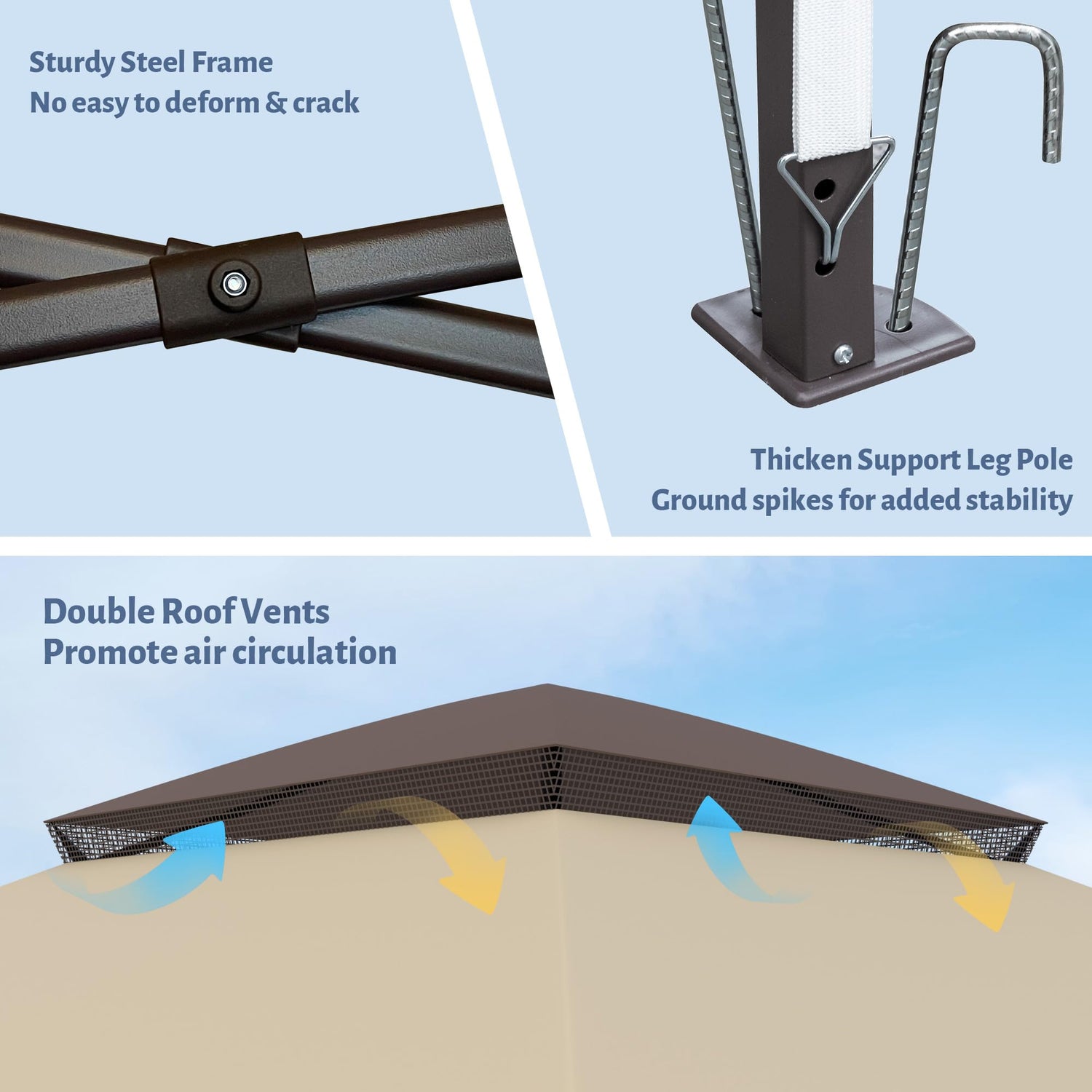 - Sturdy and Durable Construction: Built to last, our gazebo features a robust steel frame with a powder-coated finish that resists cracking, rusting, and corrosion. The upgraded support poles and connectors ensure stability and reduce wind impact. The slight outward splay of support legs after assembly is normal and adds to its stability. (Package includes stakes and ropes for anchoring purposes)