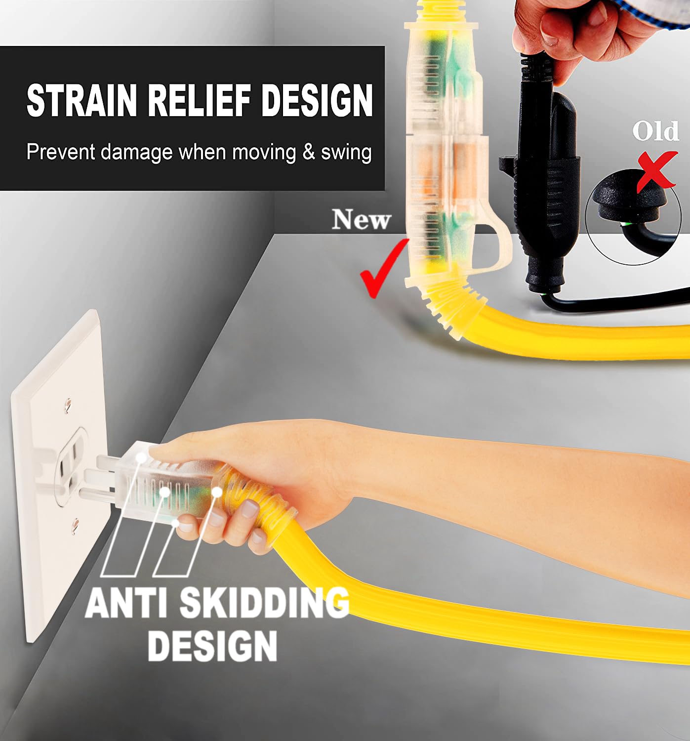 - Lighted End and Extra Size for Safety: The power socket indicator light shows that power is on and the heavy duty extension cord 100 ft is ready for work. Extra size Male NEMA 5-15P power plug and Female NEMA 5-15R power socket for safety. It is thicker and more durable than the normal type on market and has high insulation safety performance to prevent electric shock. ETL/cETL Listed for safe approval.