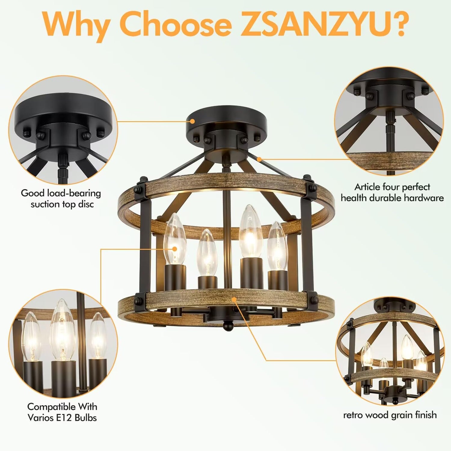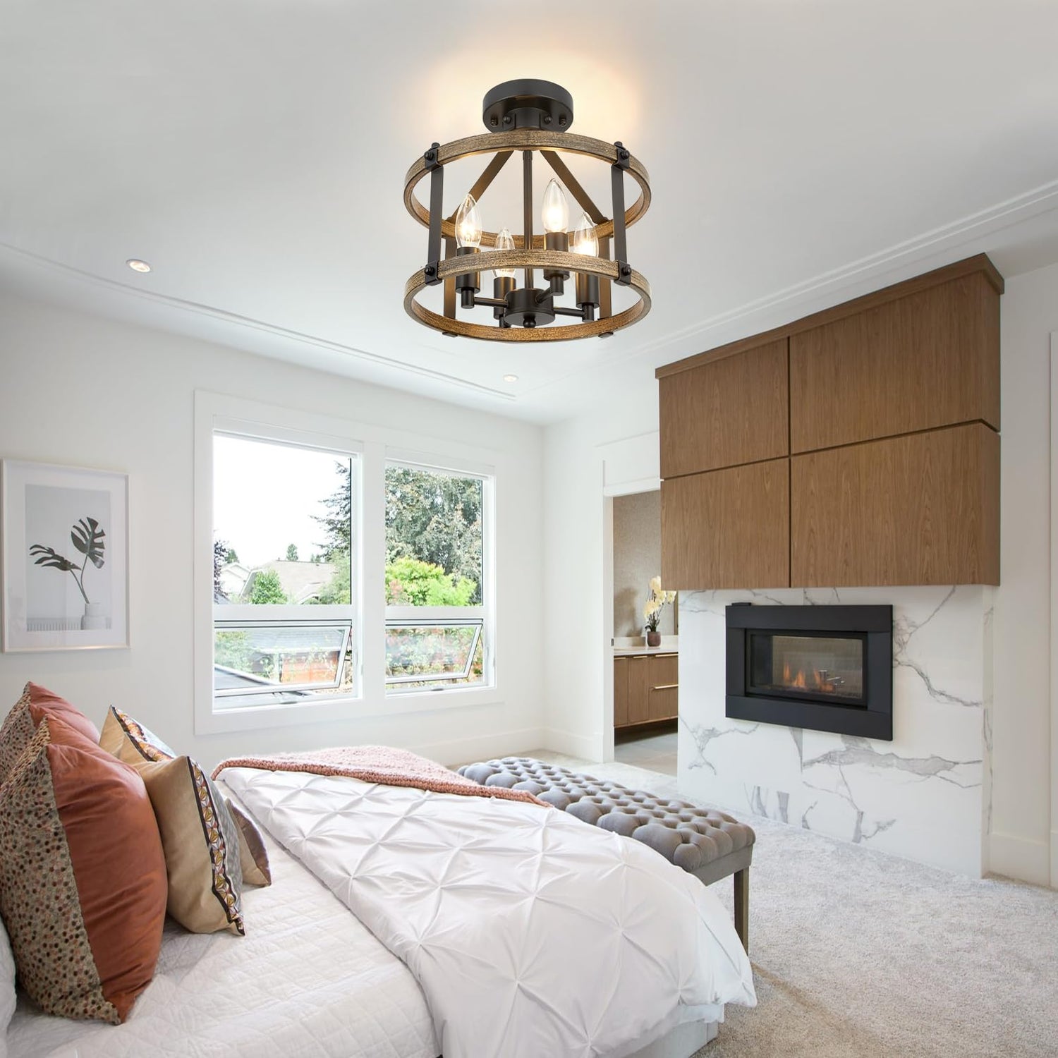 - 【Excellent Design & Premium Material】: our rustic drum semi flush ceiling light adopt a classic 4-light construction, provide your home with plenty of brightness. This living room ceiling light features a smooth matte black+retro wood grain finish, makes it much durable, withstands years of using without worrying about fading, rust or corrosion. What’s more, this vintage ceiling light is not easy to get dusty with open frame, you can clean it effortlessly