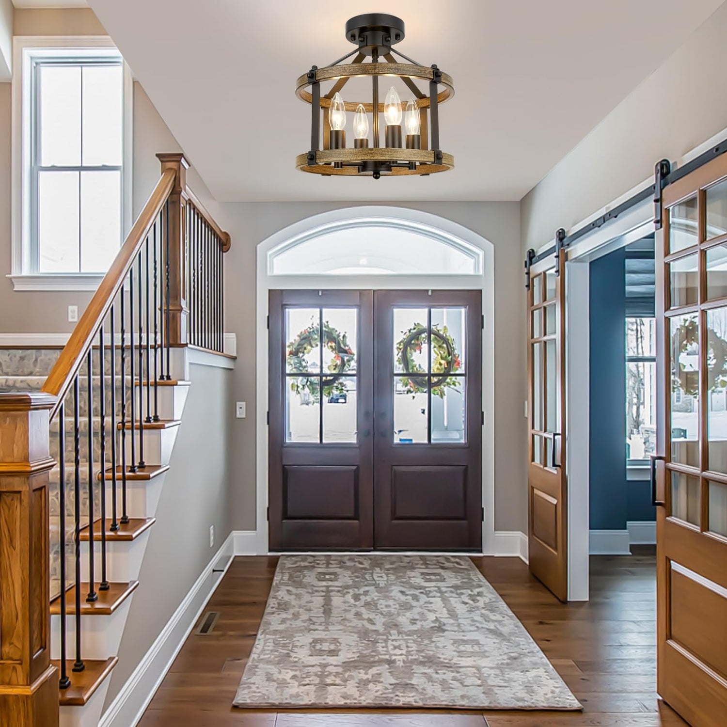 Details: 12.5" Farmhouse Semi Flush Mount Ceiling Light,4 Light Drum Rustic Semi Flush Ceiling Light , Black Metal+Faux Wood Semi Flush Light Fixture for Bedroom、Entryway、Hallway, Kitchen, Laundry Room