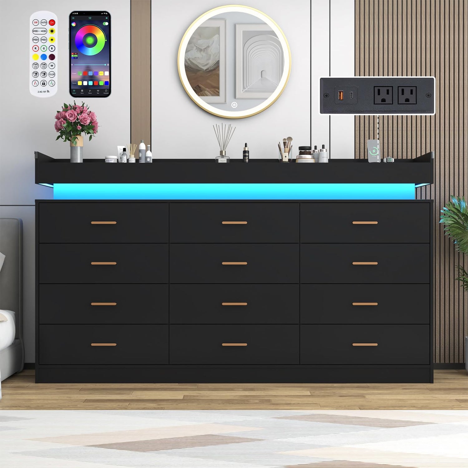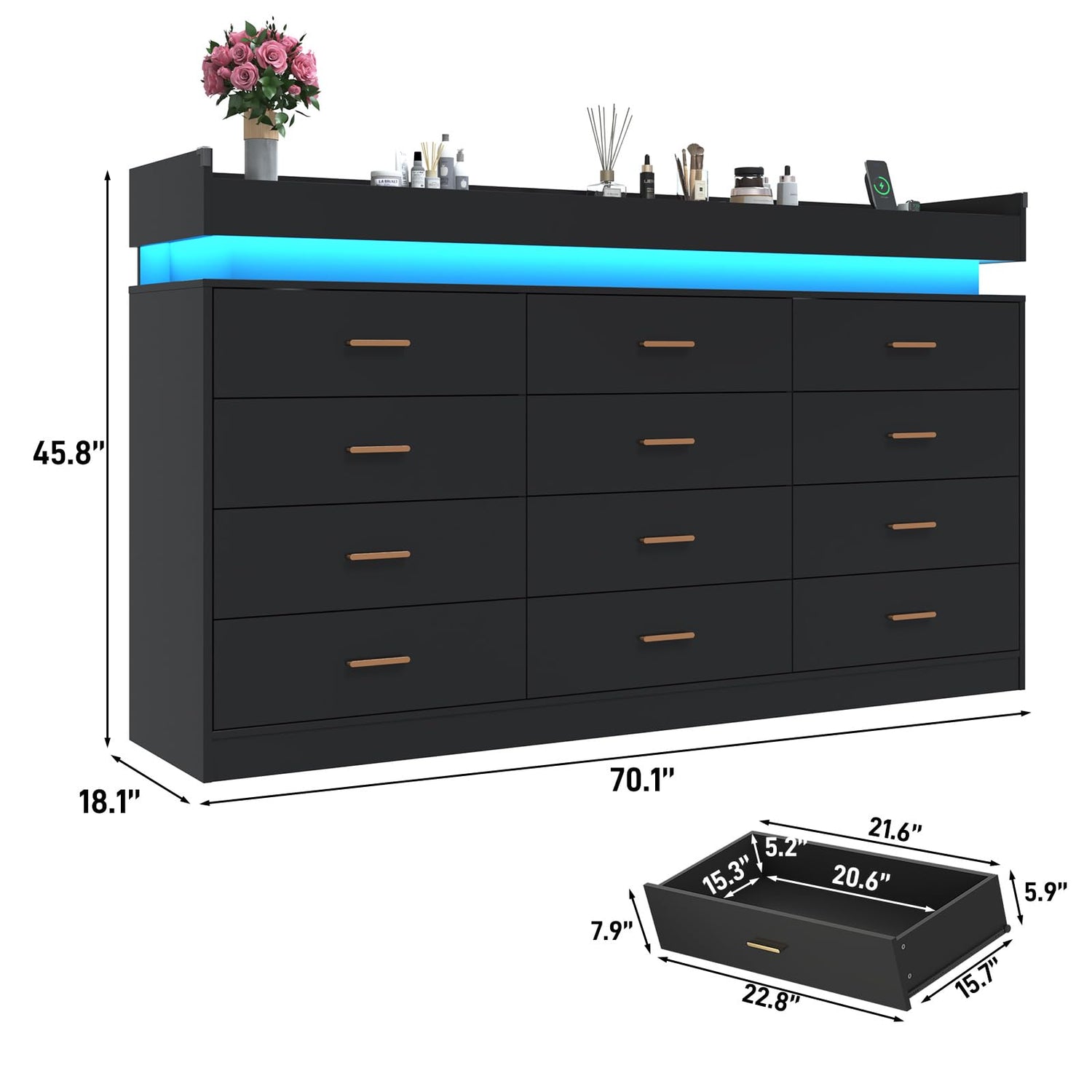 12 Drawer Dresser with LED Light and Charging Station, 70" Modern Chest of Drawers for Closet, Wide Drawer Organizer Cabinet for Bedroom, Living Room, Entryway, Hallway, Black