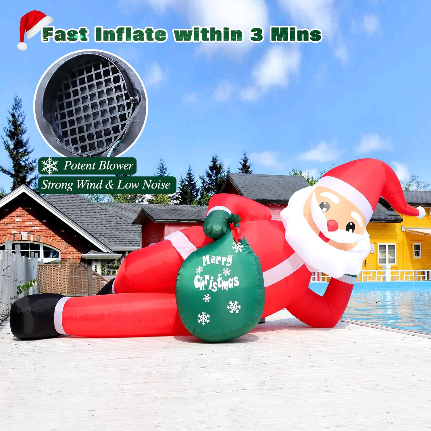 - ๐ ใ๐๐ช๐ก๐ฉ๐-๐จ๐๐๐ฃ๐๐ง๐๐ค ๐๐จ๐ใThis lying large inflatable santa claus holding a bag full of gifts is designed to be versatile and fun for Christmas night. It can be placed on the front lawn to be the first sight to greet guests, attracting the attention of neighbors and friends and inspiring them to come and explore and have fun. It can also be placed in the backyard to create an intimate family gathering atmosphere, where you and your family can share in the joy of the holiday season.