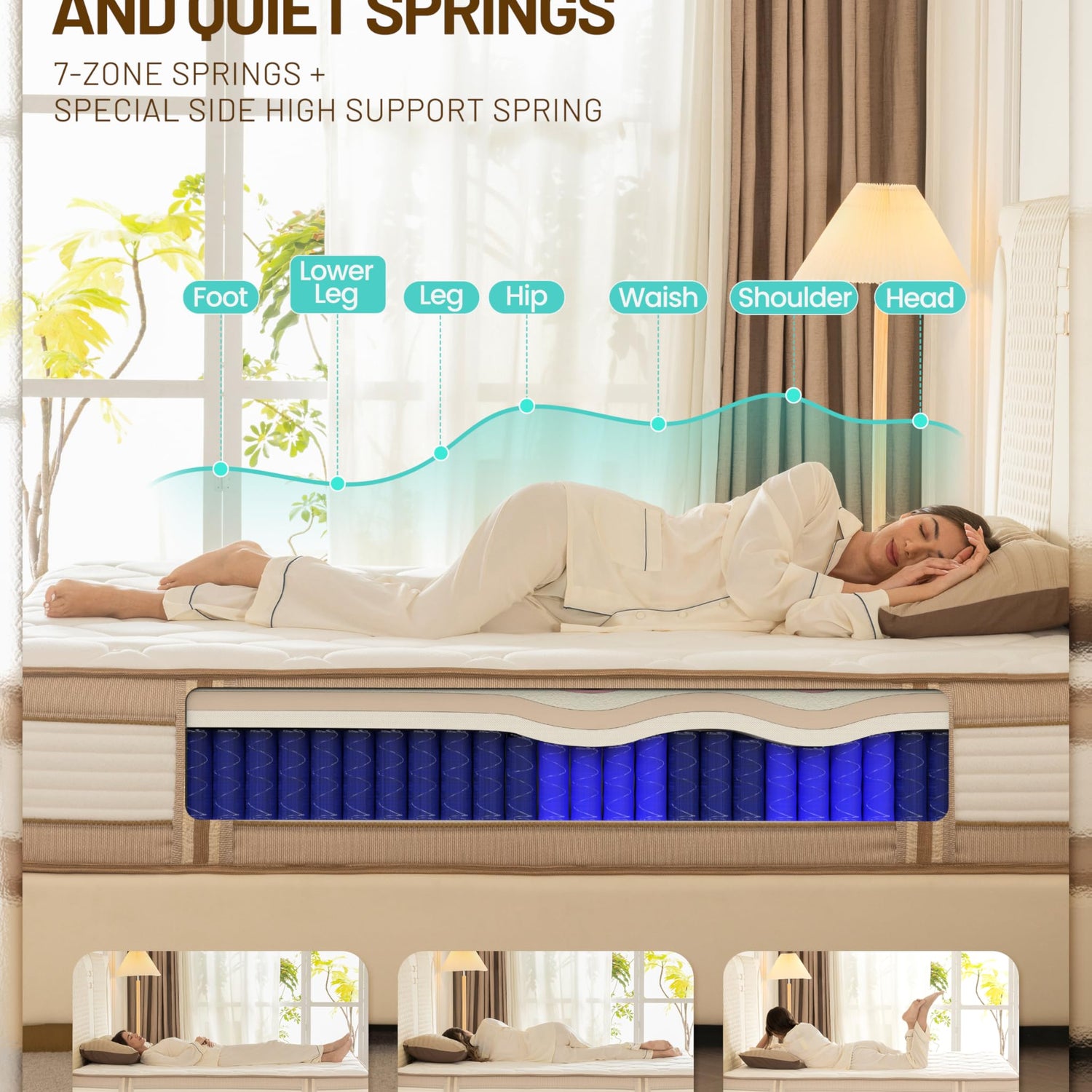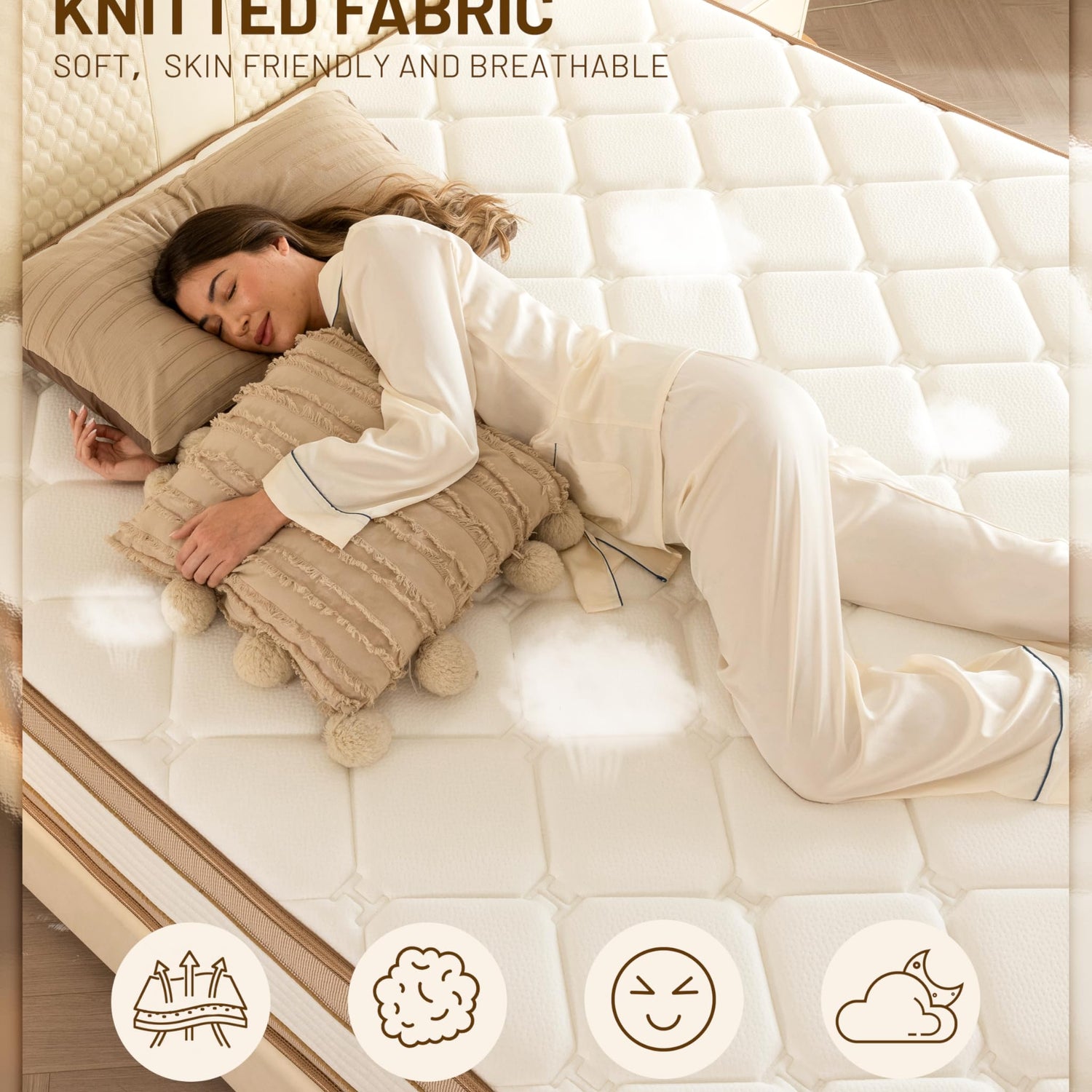 - 【Hybrid Design for Optimal Comfort & Support】Designed with a medium firm feel, this memory foam + innerspring mattress offers pressure relief and balanced support. The gel-infused memory foam contours to your body, while individually wrapped coils provide targeted support and reduce motion transfer.