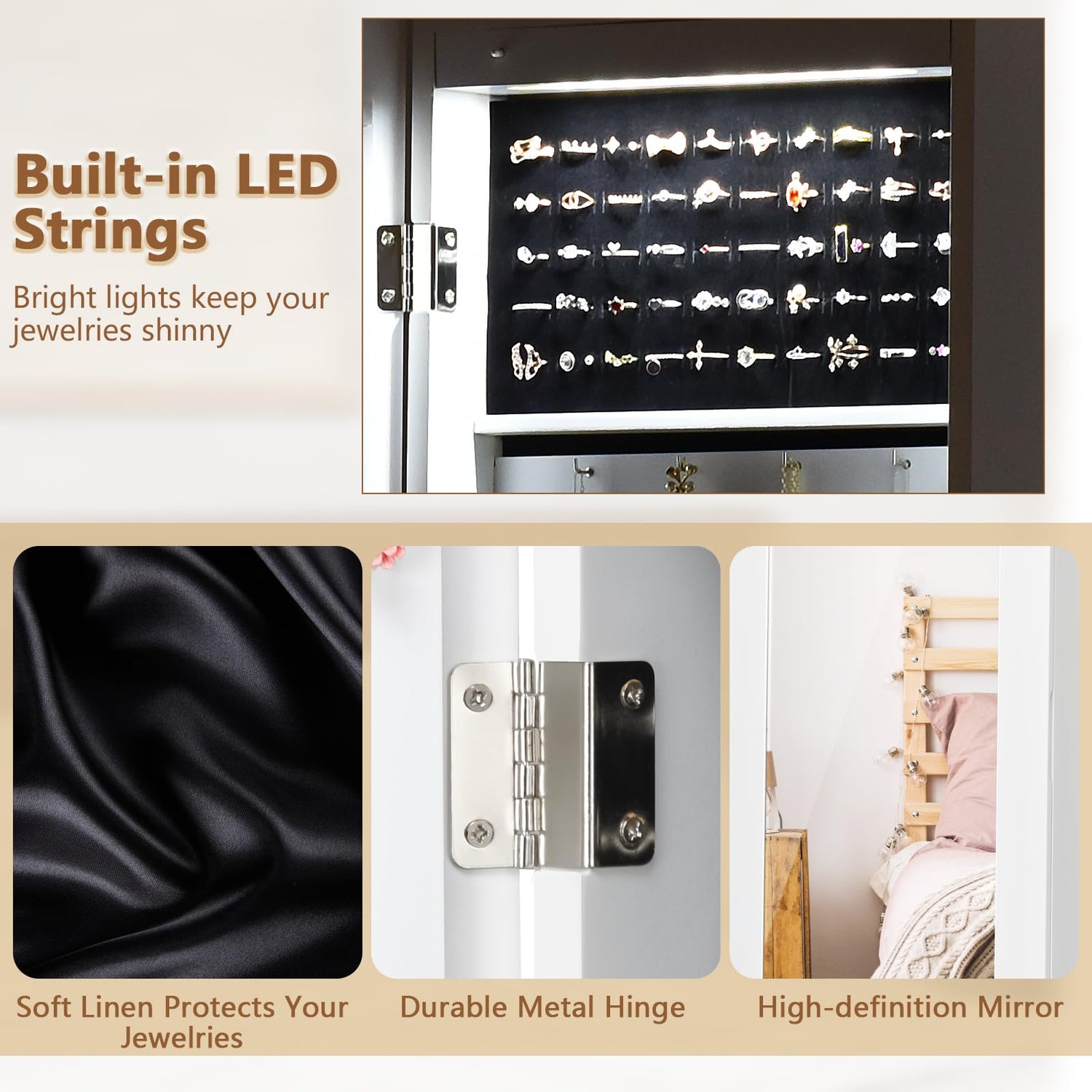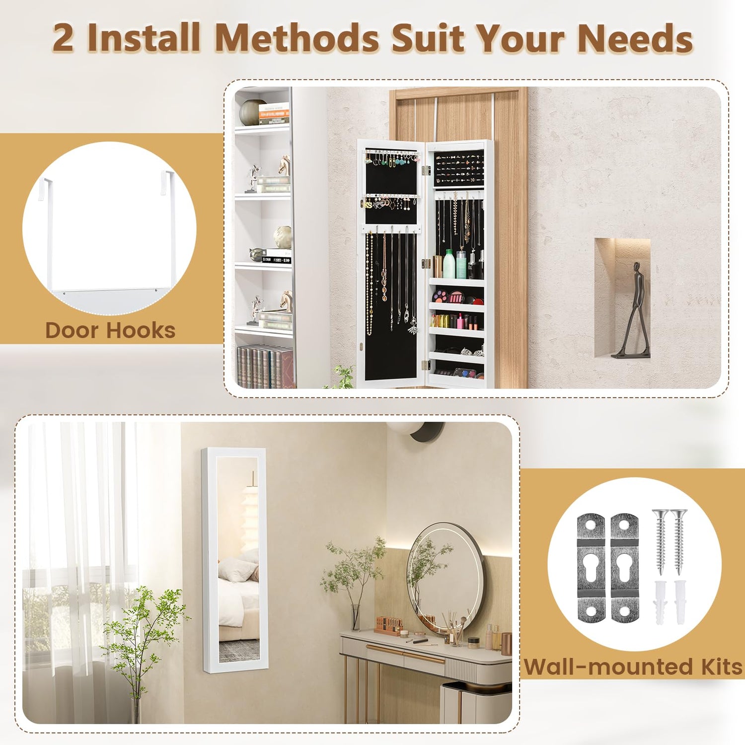 - 【Versatile Wall & Door Mounting Options】The jewelry cabinet offers you the flexibility to mount it on the wall using screws or hang it over the door with convenient hooks. Both options are designed to save valuable space in your home. Additionally, when you open the door, 12 auto-on LED lights illuminate your precious collection, allowing you to choose your jewelry effortlessly.