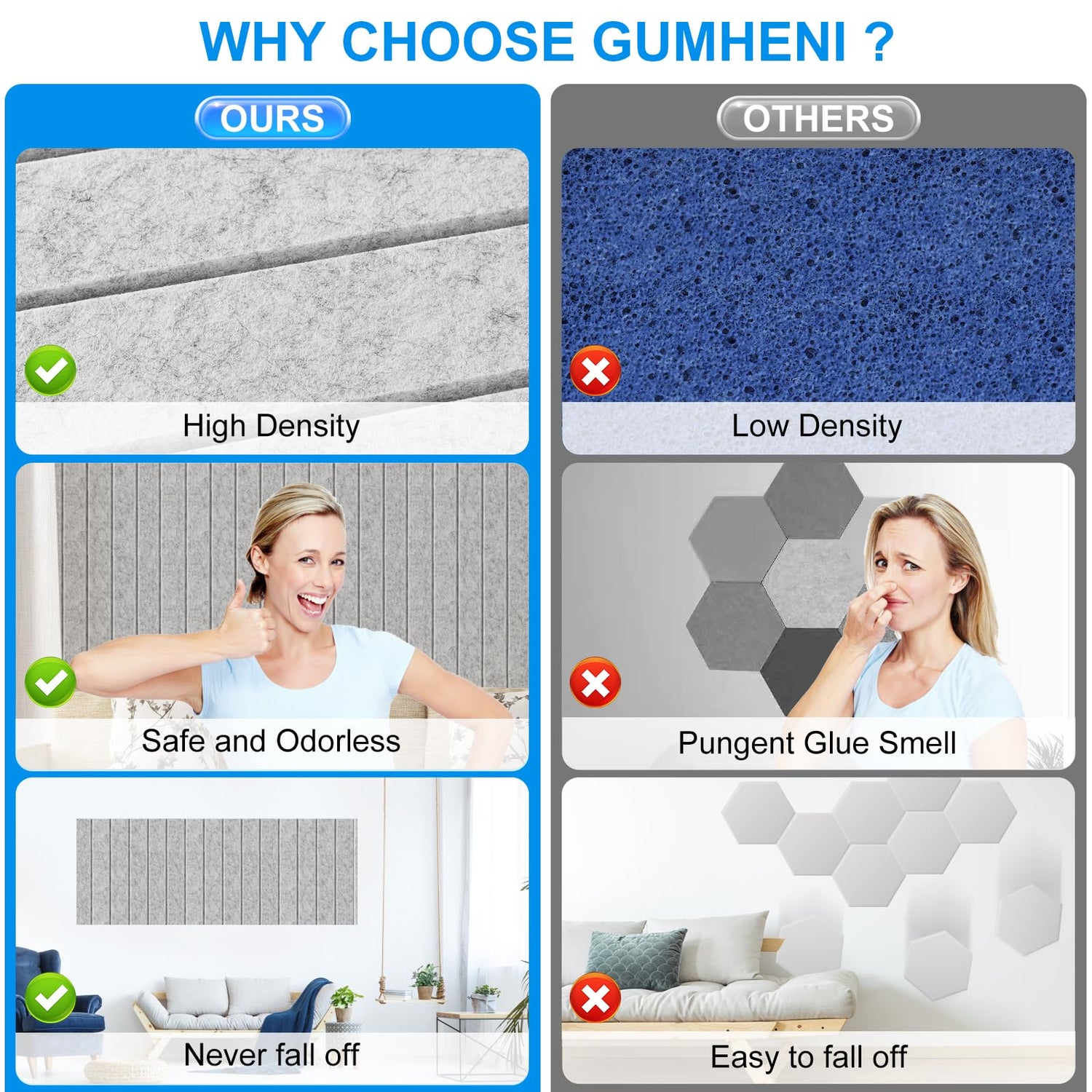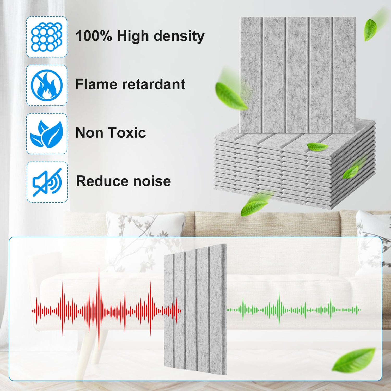 - Safe Material: Acoustic panels are made of 100% high-density polyester for better sound insulation than other soundproofing foam fillings! Odorless, non-toxic and flame retardant. Children and the elderly can also use it with confidence.