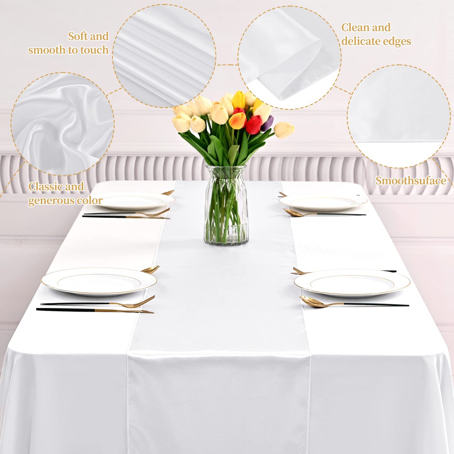 - 🌸【Premium Satin Table Runner】:The satin White table runner adopts exquisite technique, the surface is smooth without wrinkles, and the side is smooth and delicate.not easy to fade, not shrink thus reusable. seamless integrated design makes your decoration look elegant, which can add atmosphere to your party.