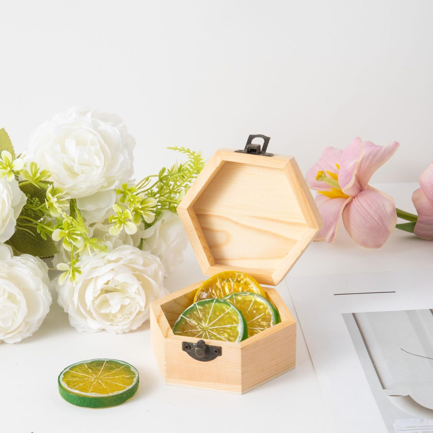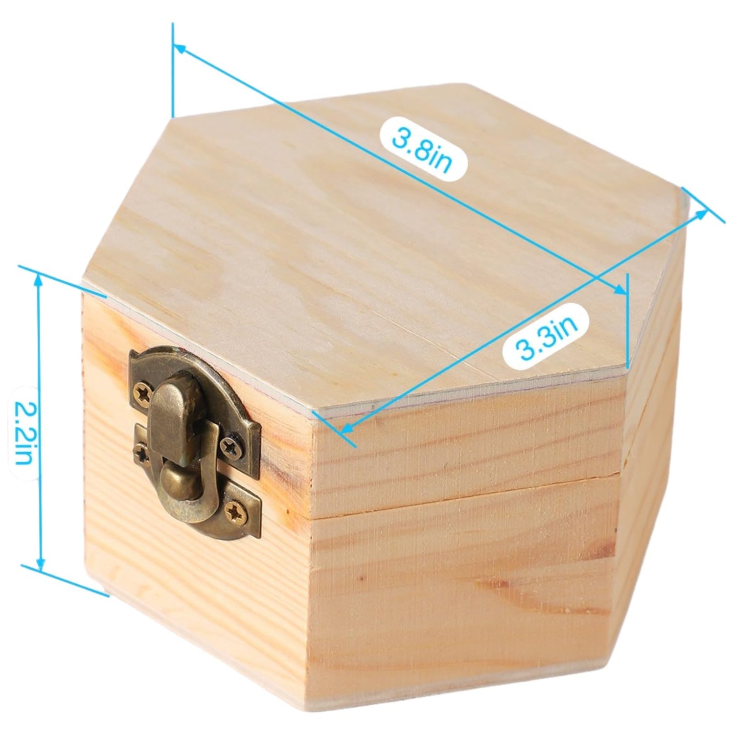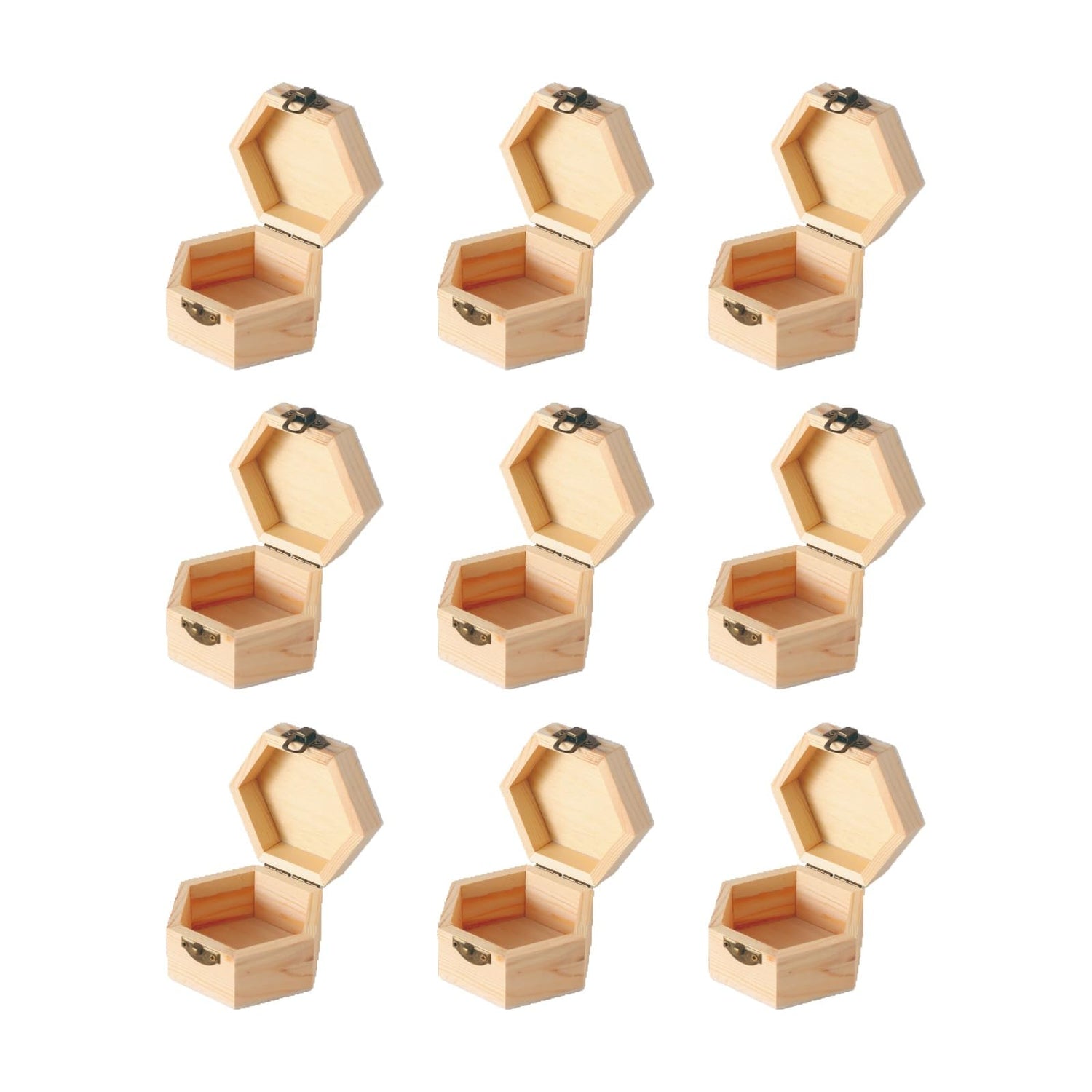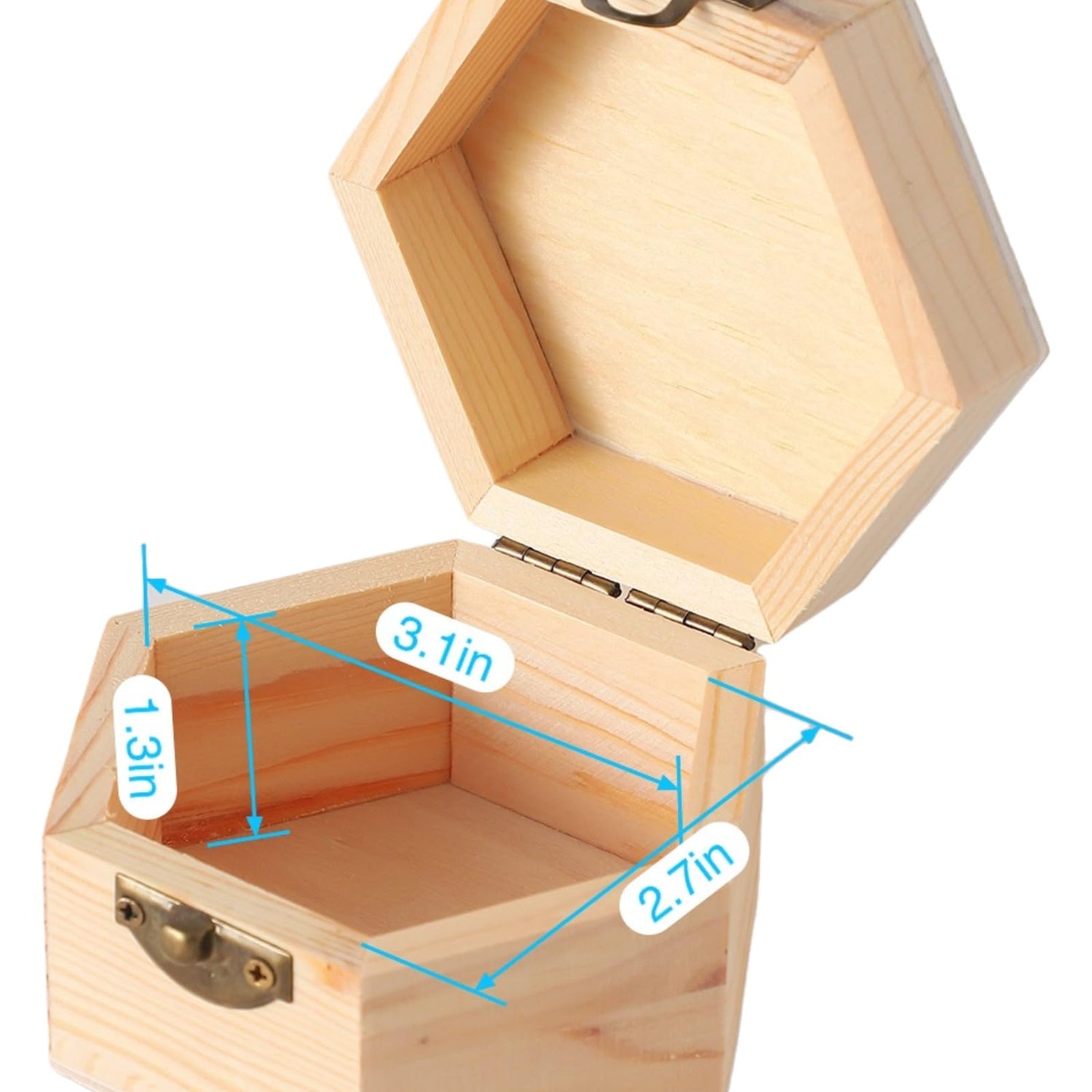 12 pcs Unfinished Vintage Wooden Hexagonal Pine Storage Boxes, 3.8X3.3X2.2in with Hinged Lids and Front Buckles for DIY Handmade Wooden Jewelry Box