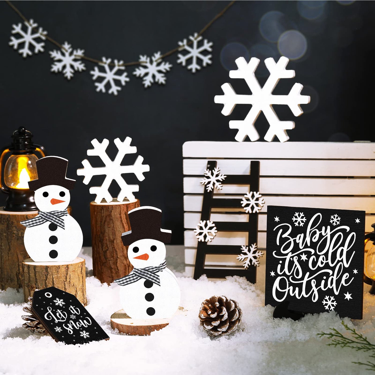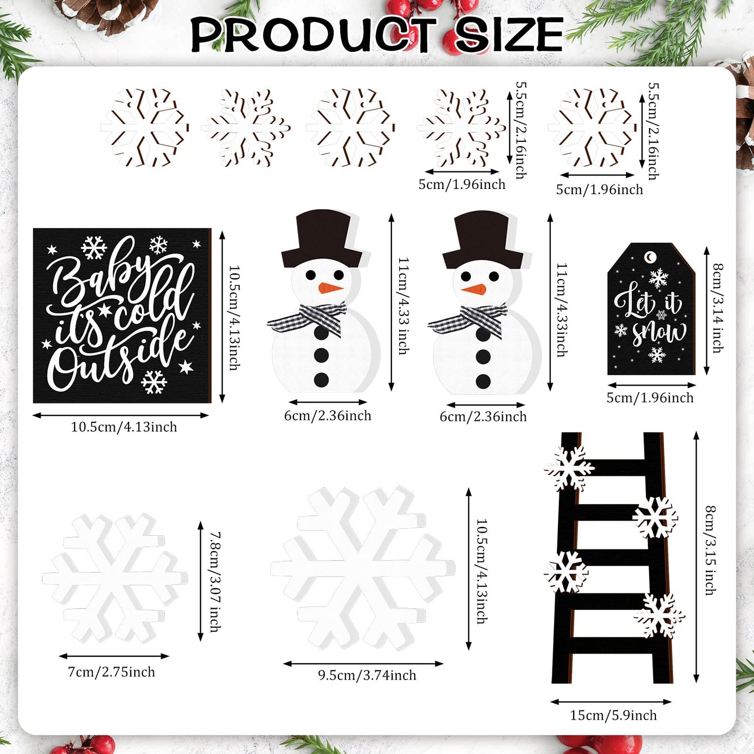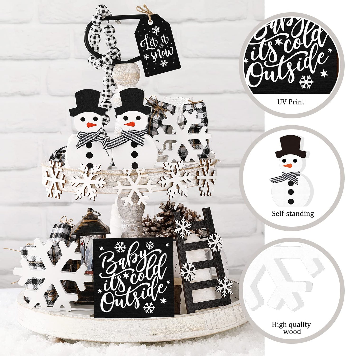 12 Pieces Christmas Winter Tiered Tray Decor Set Snowman Snowflake Table Wood Sign Farmhouse Tabletop Signs for Xmas Winter Home Table Holiday