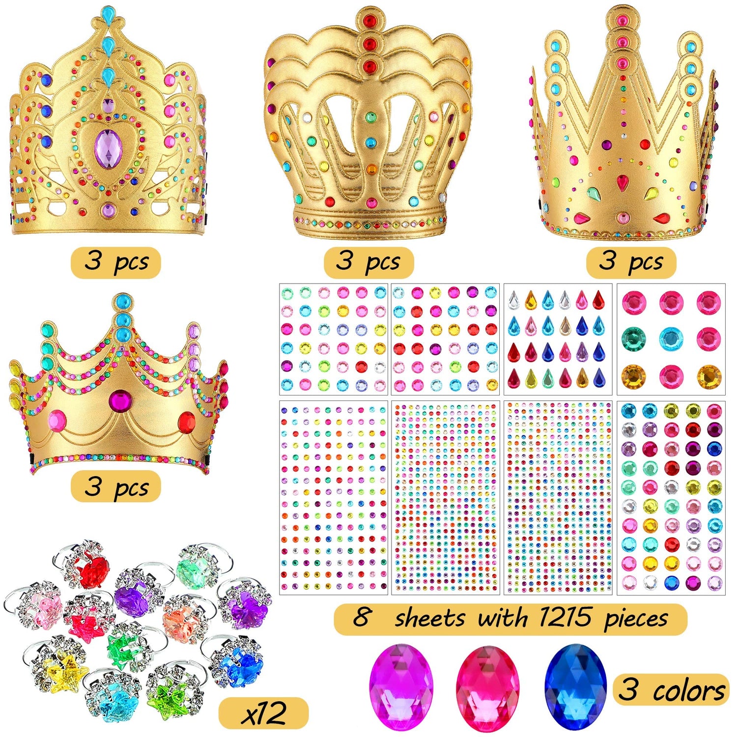 - The package includes: you will get 12 pieces of foam princess crowns in 4 styles, and each style contains 3 colors of crowns, 928 pieces of self-adhesive jewelry stickers and 12 pieces of rhinestone rings, which are enough to meet your dressing needs and make you shine and charming at your birthday party