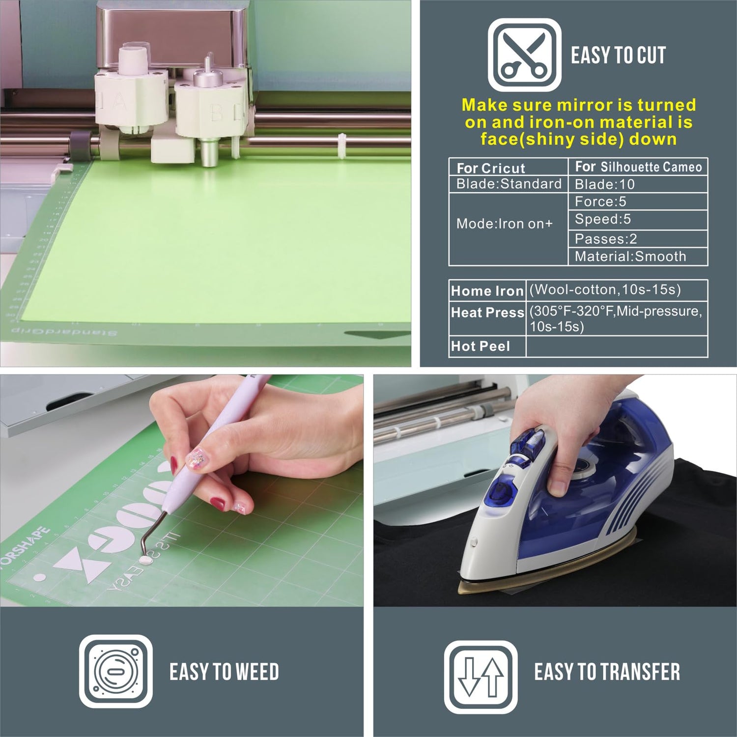 - Easy to cut, weed and transfer: Sooez HTV roller is made from thick and smooth PU material with good cutting application characteristics. With the clear cut line which let your design is easy to weed. The heat transfer vinyl is pressure and temperature sensitive and is easier to transfer to the desired surface. Our htv vinyl is compatible with all cutters machines.