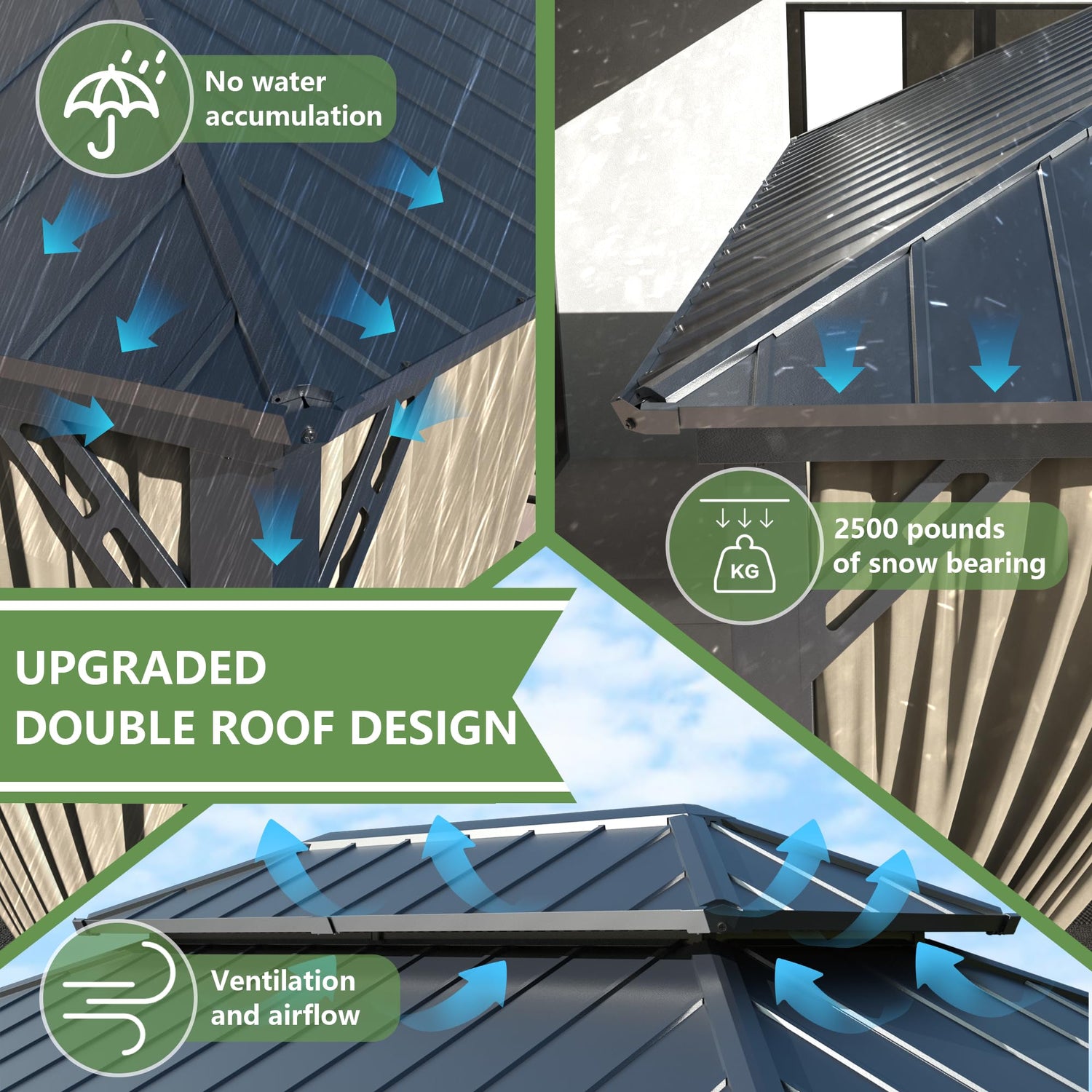 - DOUBLE ROOF DESIGN:Kullavik's gazebo adopts double roof design to help ventilation,cooling and wind speed reduction.In addition,we have adopted a drainage and snow drainage structure on the top,so that water and snow can flow into the leakage hole and the ground along the edge, so it can adapt to most snowstorm rainstorm weather.