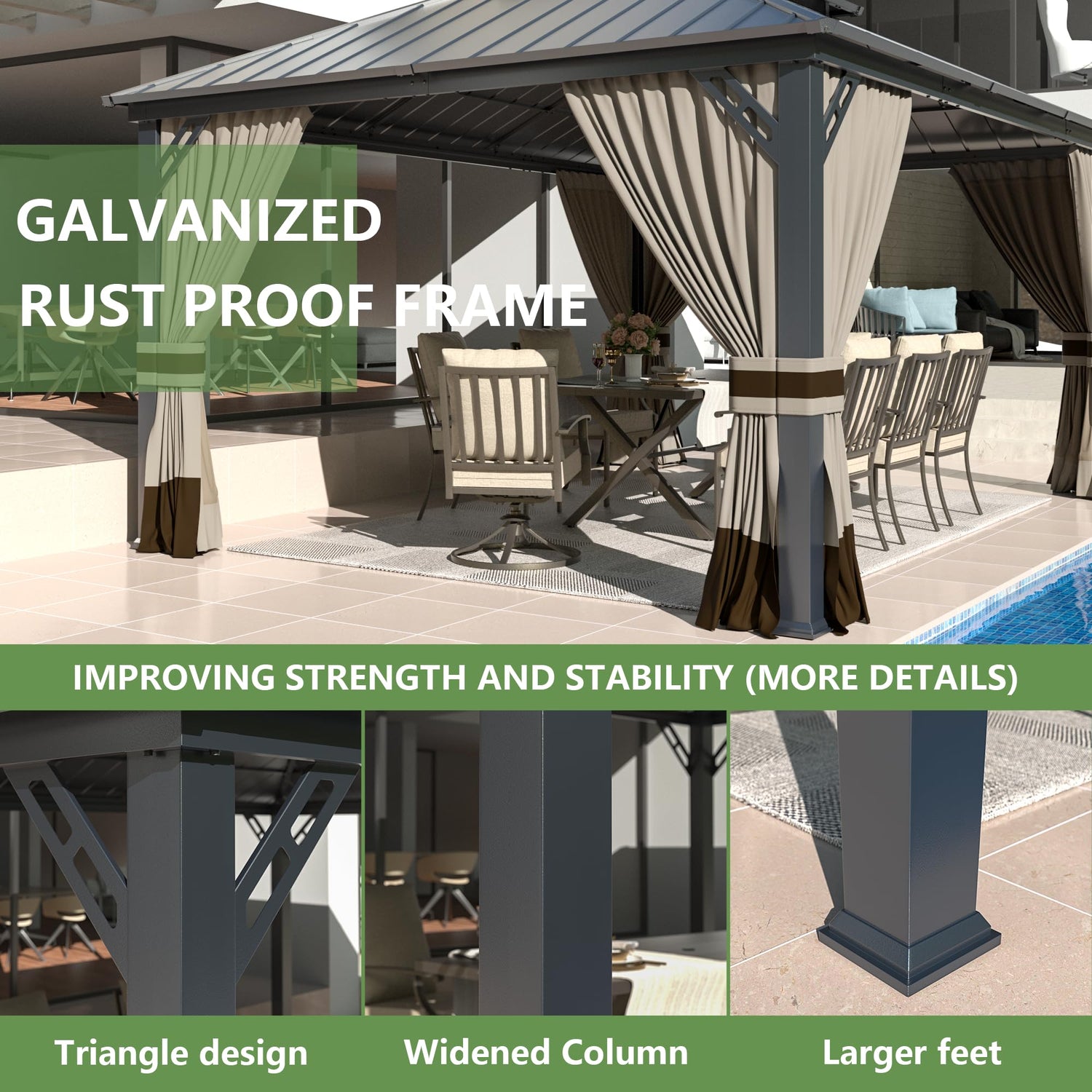 - LARGE SPACE:Our gazebo is 16 ft long,12 ft wide and 10 ft high,which can accommodate most outdoor sofa sets on the market,and is very suitable for your backyard,terrace or swimming pool area
