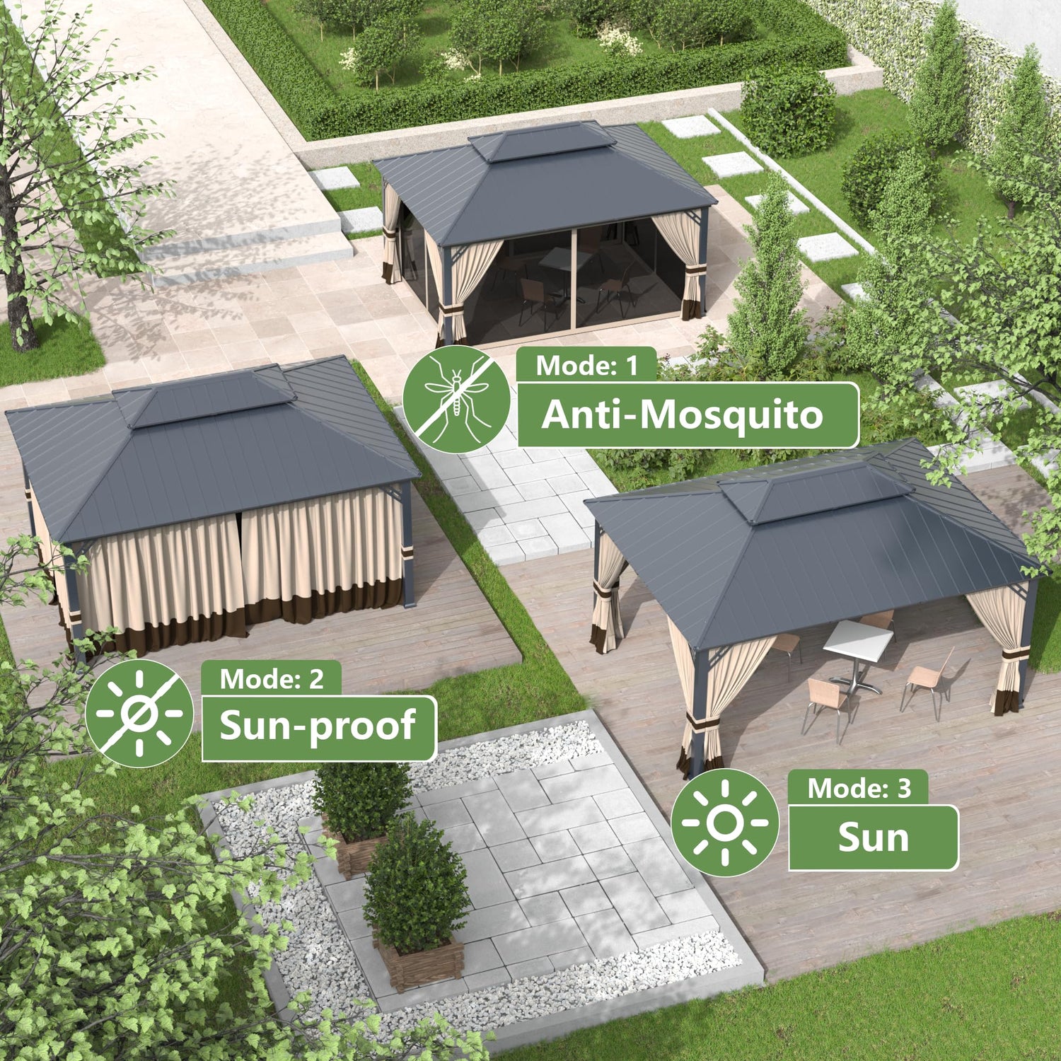 - NET,CURTAIN AND HOOK:upgraded yarn-dyed polyester curtain and PBV-coated polyester mosquito net are connected with double tracks,you can switch them at will.The zipper design allows the curtain and net to be removed for washing.The top of the pavilion is equipped with a hook,which can be used to hang lights or fans