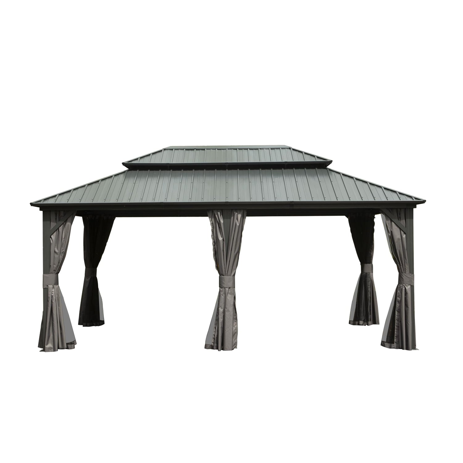 - Double Roof Design- The space between the two roof layers allows air to circulate, creating a ventilation system that helps keep the gazebo cool and comfortable even on hot summer days. Plus, the slope of the roof helps rain and snow to flow down and off the structure, reducing the risk of damage and ensuring a long-lasting, durable roof.