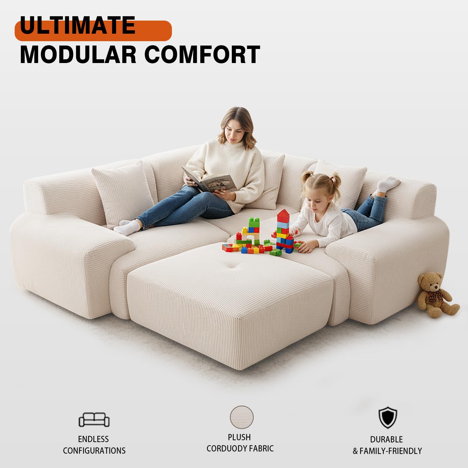 120" Modular Boneless Couch Cloud Couch Sectional Couches for Living Room with Ottoman, Modern L-Shaped Modular Sectional Sofa with Deep Seat, Corduroy 3-Seater Sleeper Sofas for Living Room (Beige)
