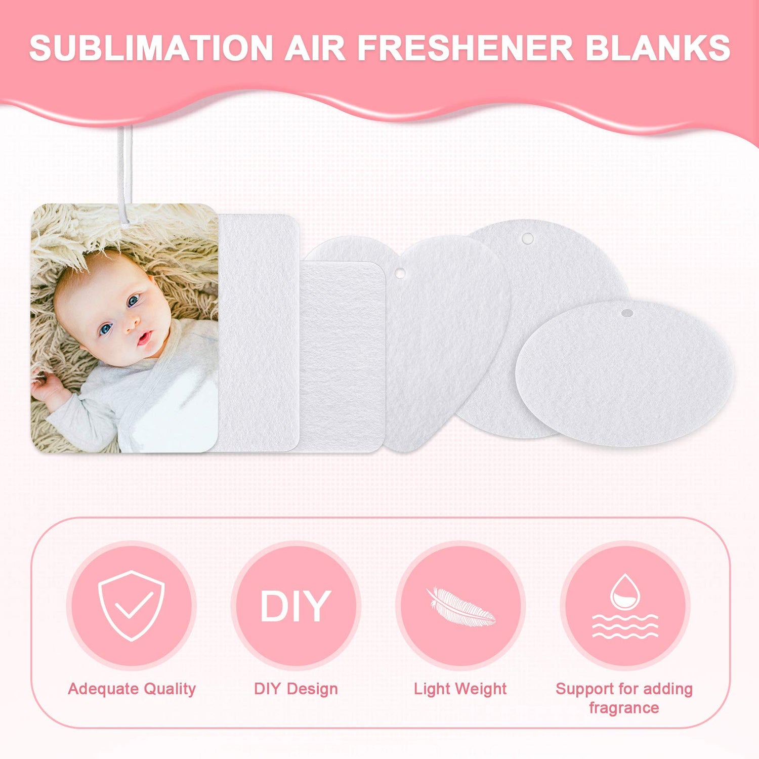 - Large quantity: package comes with 120 pieces sublimation air freshener blanks in 5 different styles, including 40 vertical rectangles, 20 horizontal rectangles, 20 square and 20 circle, 20 heart, and there are 2 pieces of long elastic rope, nice combination to meet your needs