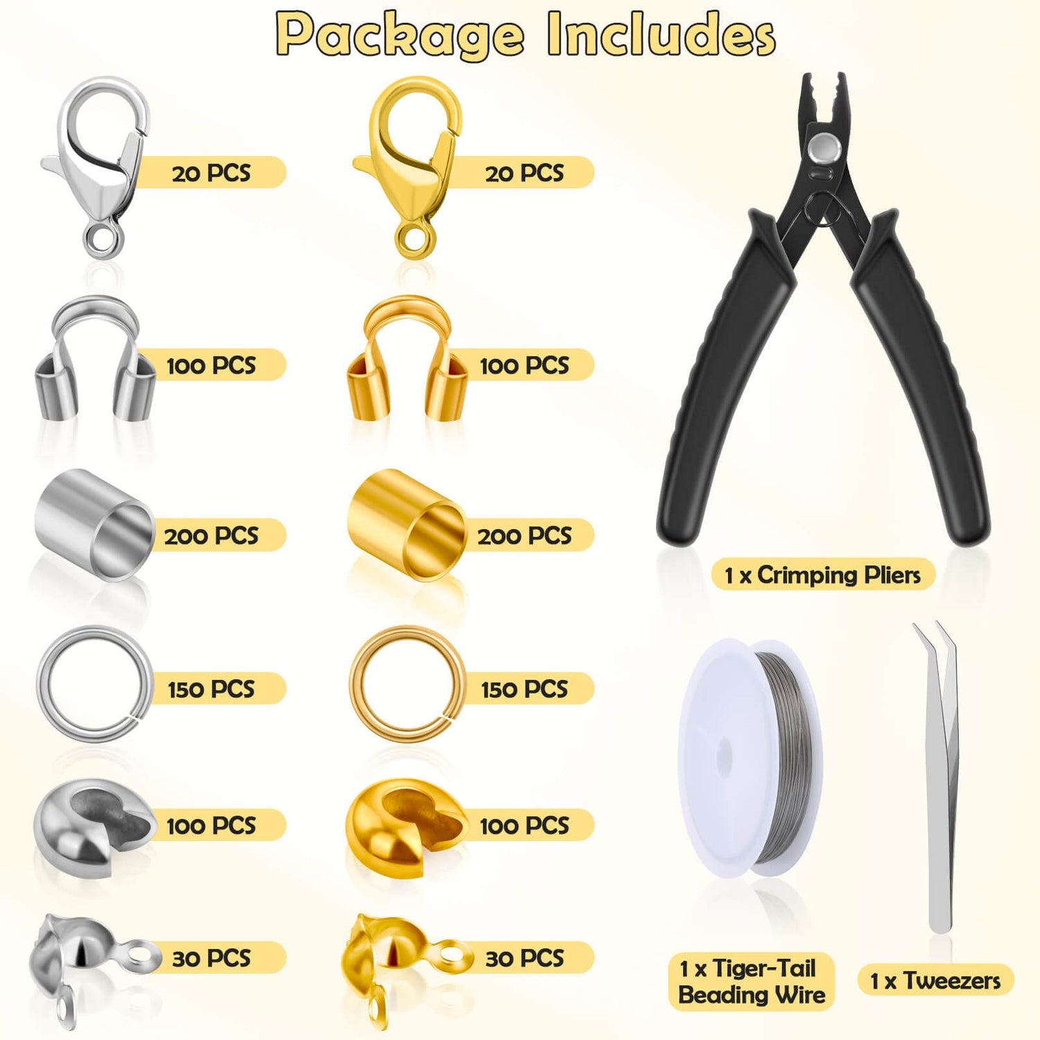 1200 Pcs Crimp Beads Kit for Jewelry Making, Acejoz Crimp Beads, Crimp Covers, Crimp Tubes and Wire Guardians, Lobster Clasps, Jump Rings, Crimping Pliers and Beading Wire for Jewelry Making