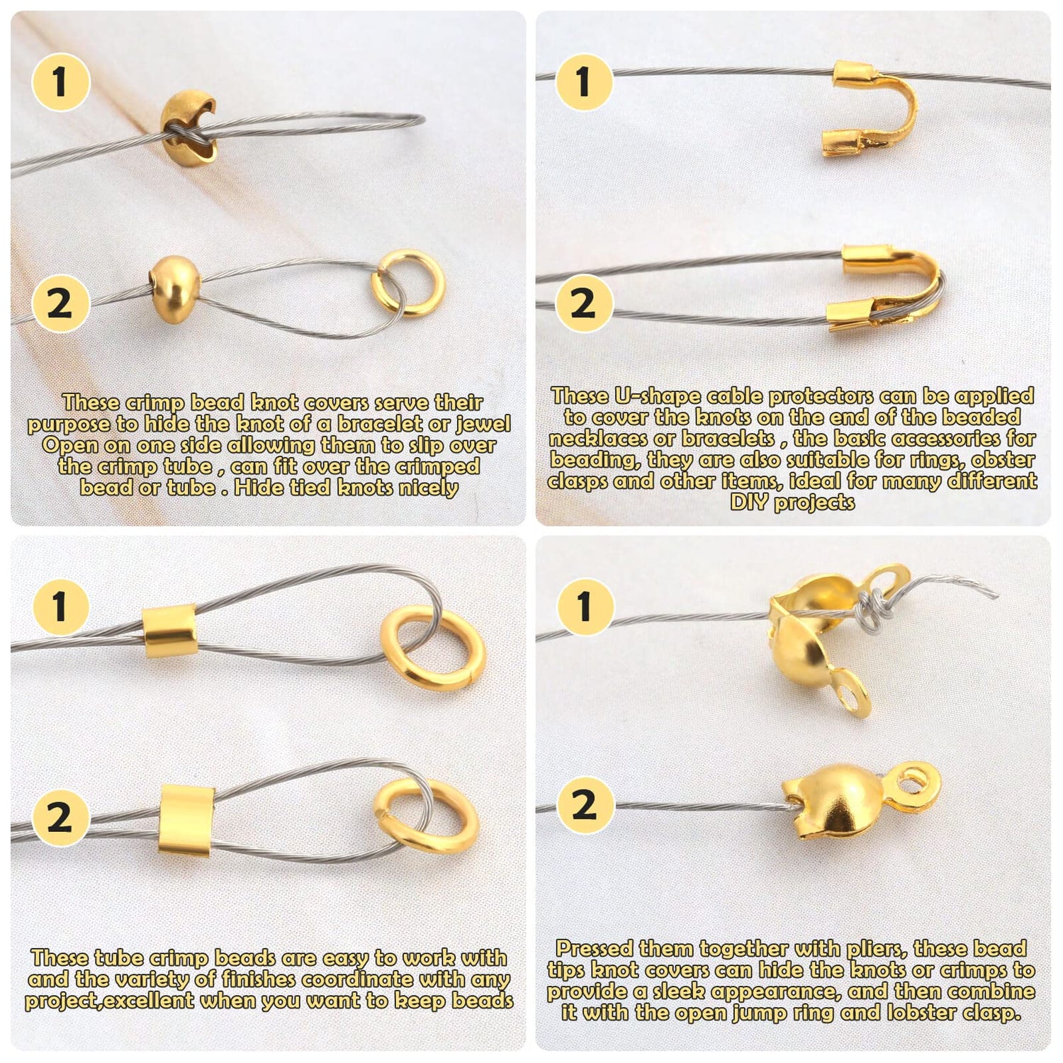 - What You Get - You will get a box of crimp beads in 2 colors, including 400 pieces brass crimp tubes beads, 200 pieces crimp bead covers, 60 pieces knot covers, 200 pieces wire guardians, 40 pieces lobster clasps, 40 pieces jump rings, sufficient amount can meet your different needs of jewelry making