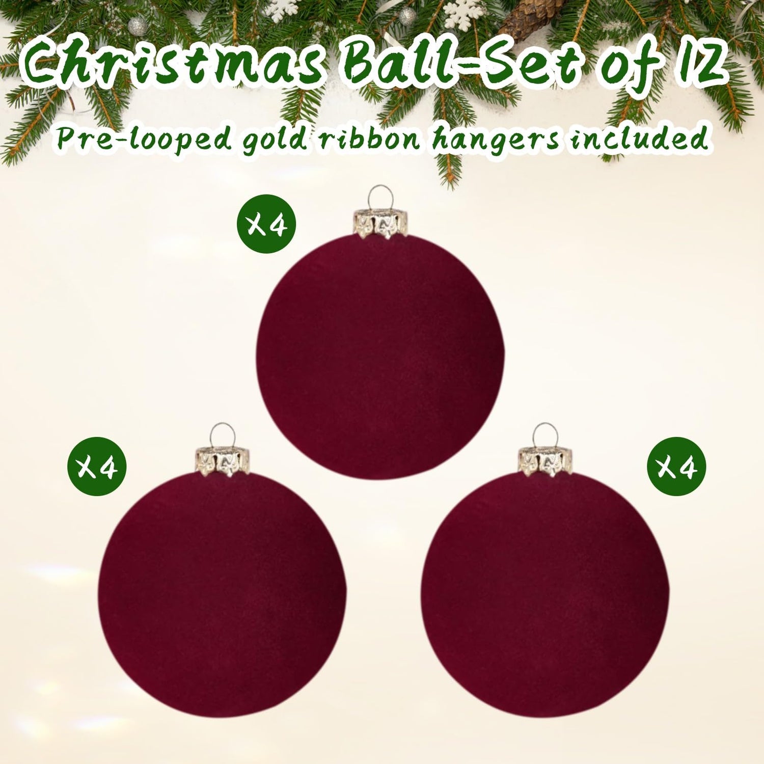 12pcs Christmas Tree Hanging Ball Decoration 2.4Inch Velvet Christmas Ornaments Balls Flocked Shatterproof Plastic Xmas Tree Ball for Party Holiday Wedding Home Decor (1, Burgundy, 12PCS)