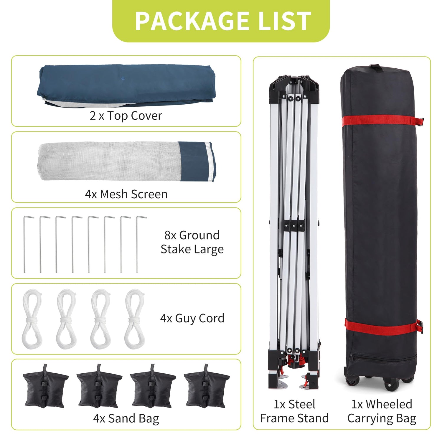- Easy Assembly: The easy-up gazebo can be assembled by one person in just 10 minutes without the need for extra tools. It offers three height settings—allowing you to customize the height to your preference, and comes with detailed installation videos and manuals for guidance.