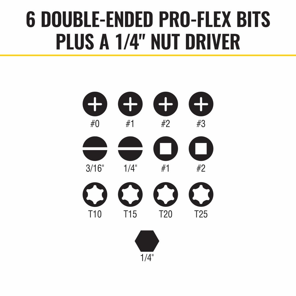 - INDUSTRIAL STRENGTH BITS: #0, #1, #2, #3 Phillips, 3/16-Inch, 1/4-Inch Slotted, #1, #2 Square, T10, T15, T20, T25 TORX and 1/4-Inch Hex