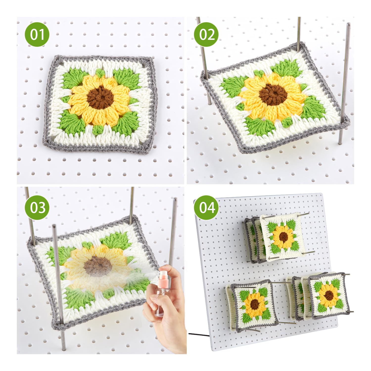 - 3.Crochet blocking board with 20 pegs, a crochet square blocking board, and 2 storage bags for easy organization and portability