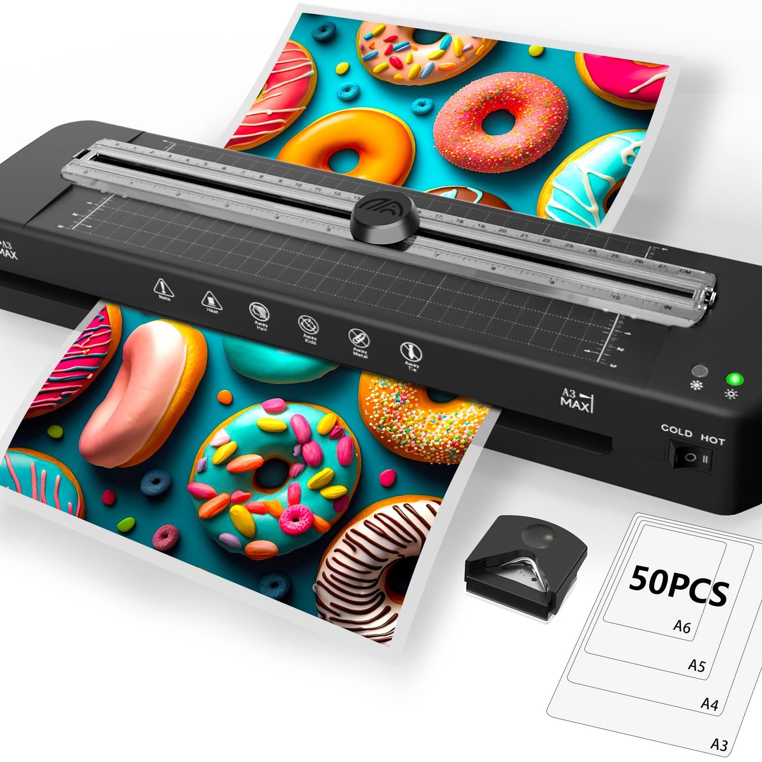- 5 in 1 Laminator Machine Set: 13 inch laminator*1, 50pcs thermal laminating sheets (5*A3, 5*A4, 20*A5, 20*A6), paper cutter*1, corner rounder*1, user manual*1. The paper cutter can cut pouches as your need, the rounded corner can trim the sharp edges and corners. 50pcs laminating sheets can fulfill your laminating needs.
