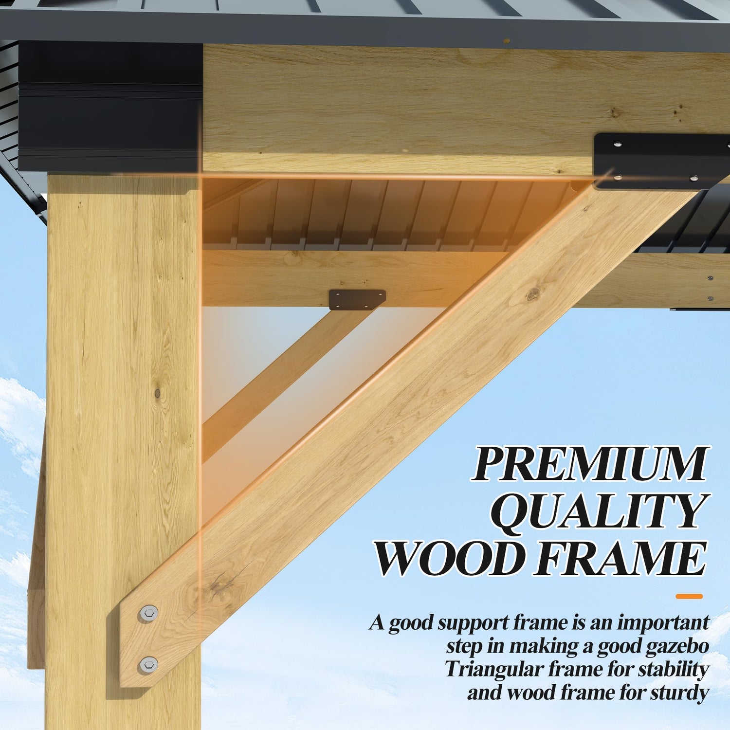 - ⛱️PREMIUM QUALITY WOODEN FRAME: Our wooden gazebos are constructed with high quality wood frames that are FSC certified to ensure the patio vented roof gazebo durability and stability. Made of sturdy wood that is durable and long-lasting, providing you with a long-lasting outdoor deck wood gazebo. Besides, we maintain the ecological balance and biodiversity of our forests by complying with FSC standards. And promoting ecologically sustainable development in making this wood frame gazebo