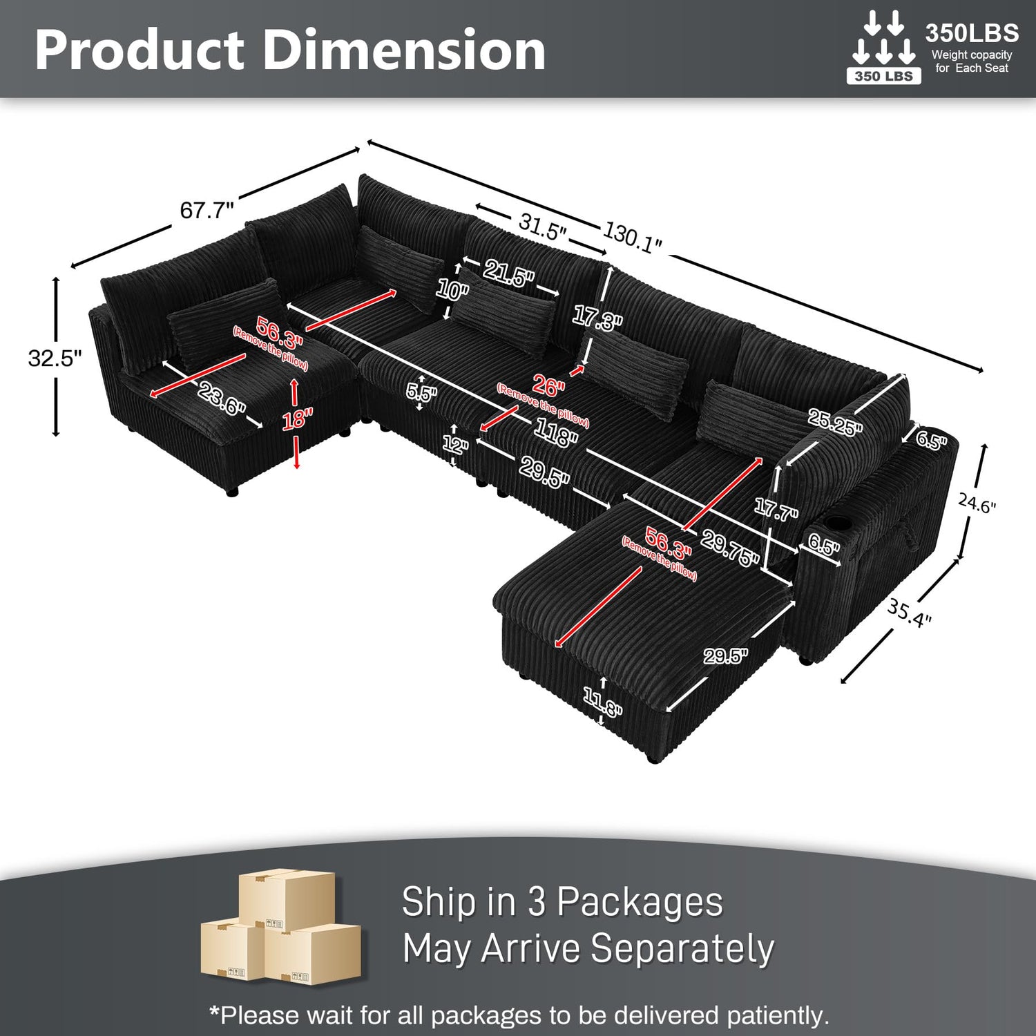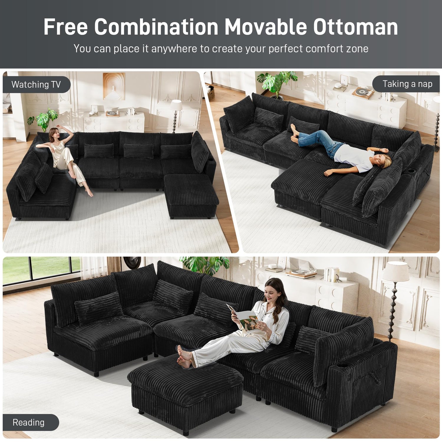 130" Oversized Cloud Couch Large Modular Sectional Sofa Modern U Shaped Sectional Couch 6 Deep Seat Sofa Set for Living Room Comfy Plush Corduroy Cloud Sofa with Ottoman, USB Port, Cup Holder, Black