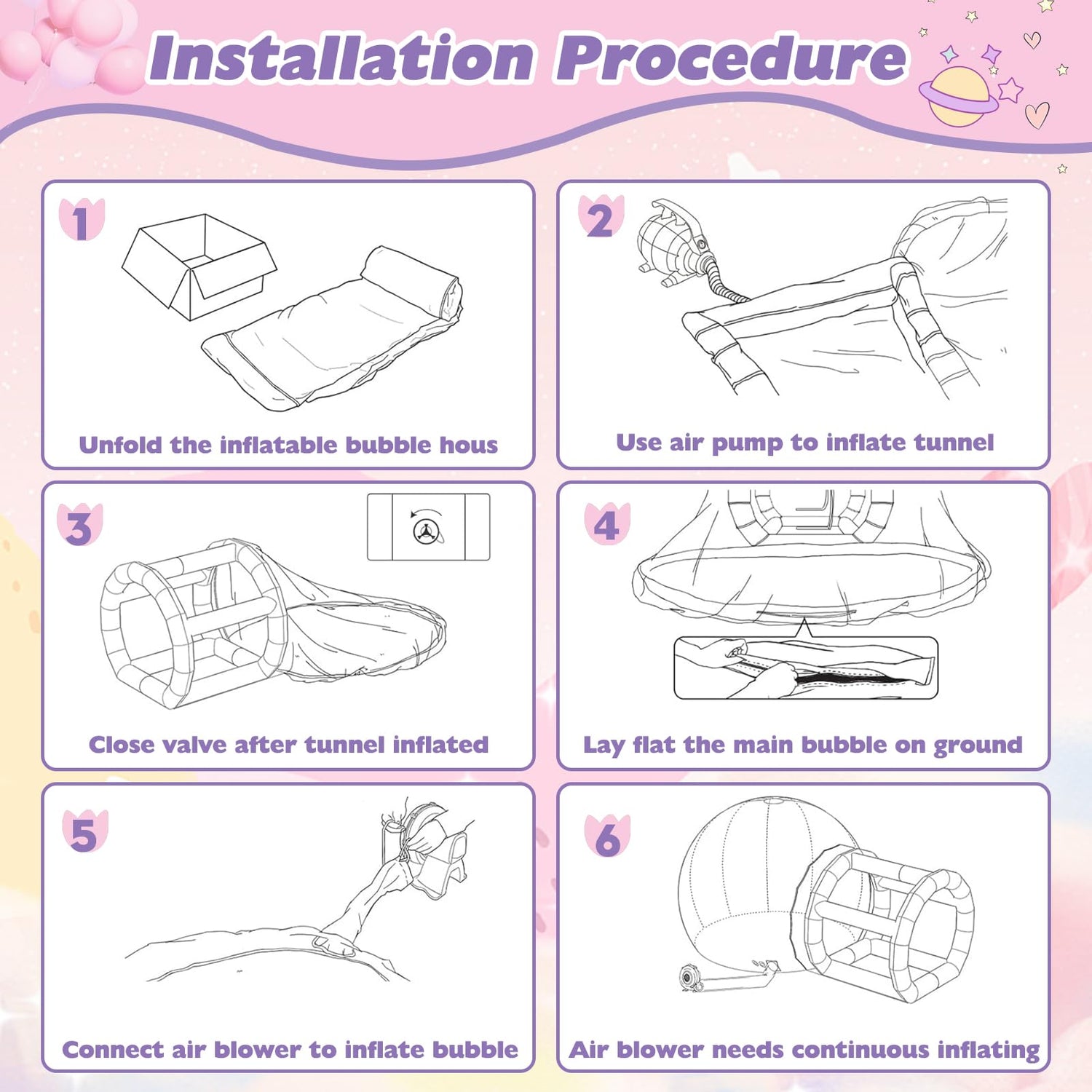 - 【5 MINUNTES INSTALL】- You just need to take out the bubble house, connect the hair dryer, click to inflate, pull the ventilation hole and fix it in the position you want to complete the installation, after plugging in the power supply, it can be kept inflated during the whole process, and you can start your party in five minutes