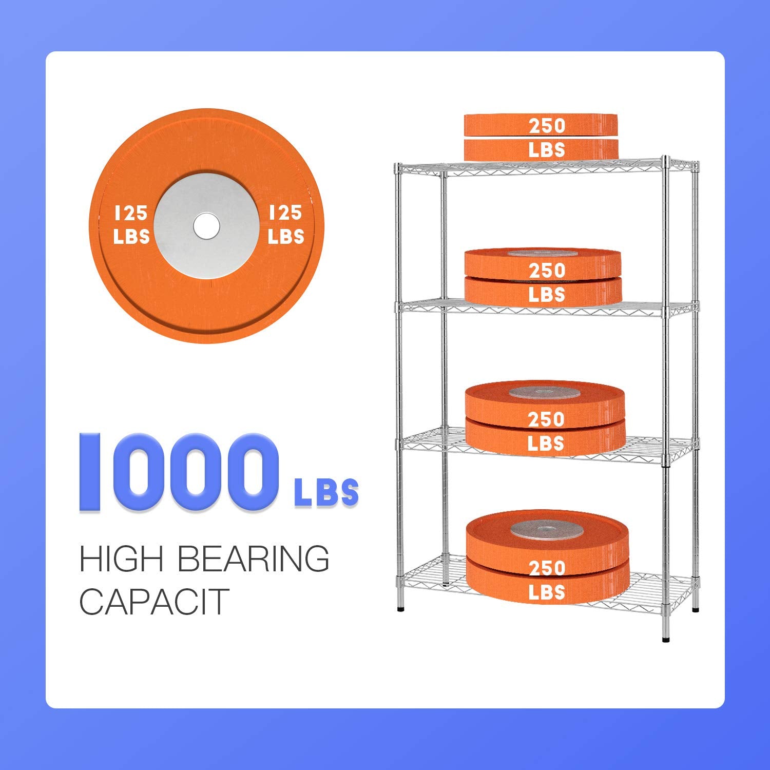 Details: This is 4 tier wire shelf,all the shelf is can adjust height .The shelving unit is made of steel wire shelving.The weight limit for each shelf is 250 pounds, and the total weight limit for the entire shelf is 1000 pounds. The storage shelves provide an enormous amount of space for you and no occupy too much space.You can use this wire shelving in the kitchen bedroom garage and more. Tools, books,and other things can be placed on this wire shelving.