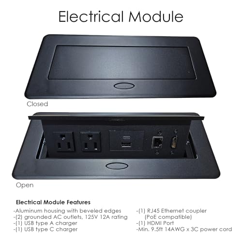 - ADVANCED POWER & DATA: This conference table offers 2 power and data modules complementing your base color. The silver base module includes 2 AC outlets, 1 USB-A, 1 USB-C, and 2 RJ ports. The black base module features 2 AC outlets, 1 USB-A, 1 USB-C, 1 RJ port, and 1 HDMI port. The module in this meeting room table is inset into the tabletop and can be closed flush when not in use, while keeping cables neatly hidden for a clean, organized look and easy device connectivity.